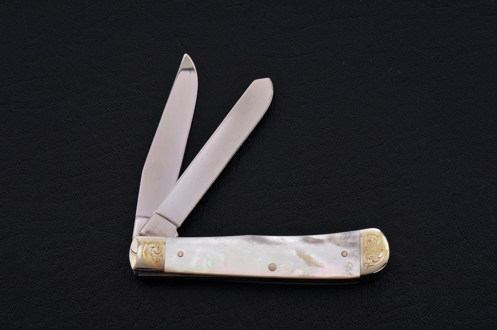 1 of Only 50 Case Knives ''Mother of Pearl'' SeriesFolding Knife, with Ruby. Knife is a pattern #8254 SS Trapper with engraved bolsters, 4-1/8'' overall closed length, pearl handle with a single ruby inlaid into an engraved diamond pattern shield. The main blade is numbered ''32 of 50''. Mfg'd 2001. Included is the original black velvet case with cardboard slipcover. In excellent as new condition, never carried or sharpened. Pearl handles show a few minor handling marks. Est.: $250-$400.