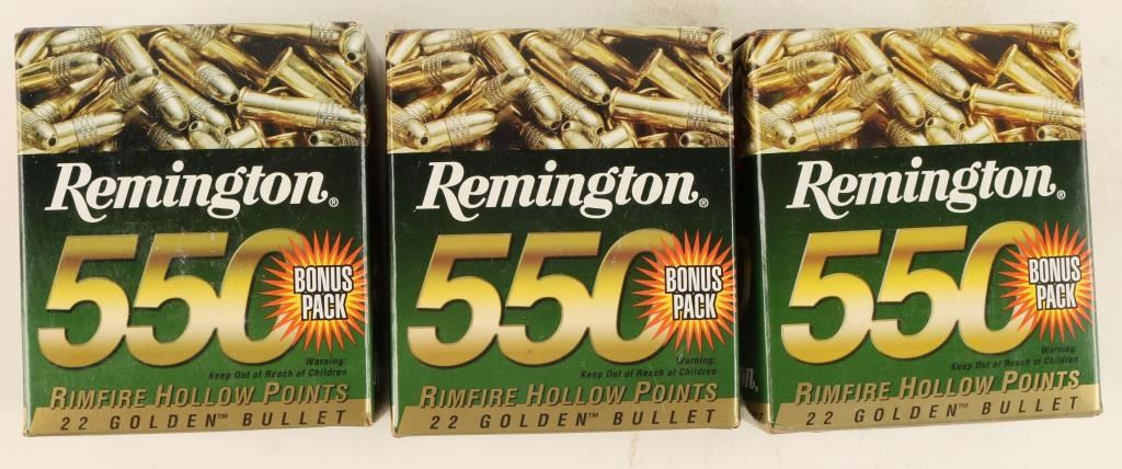 Consisting of three 550 round boxes of Remington Golden Bullet high velocity 36 grain brass-plated hollow point ammunition.