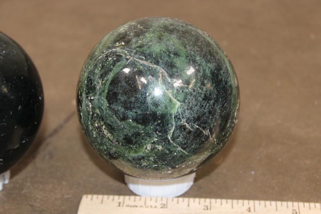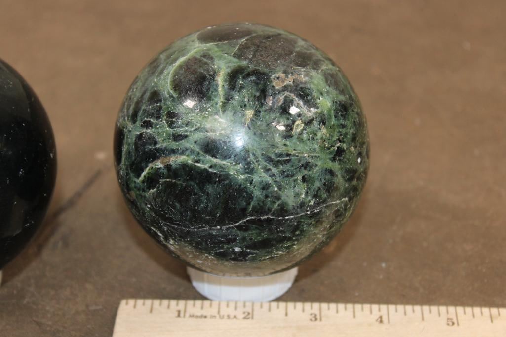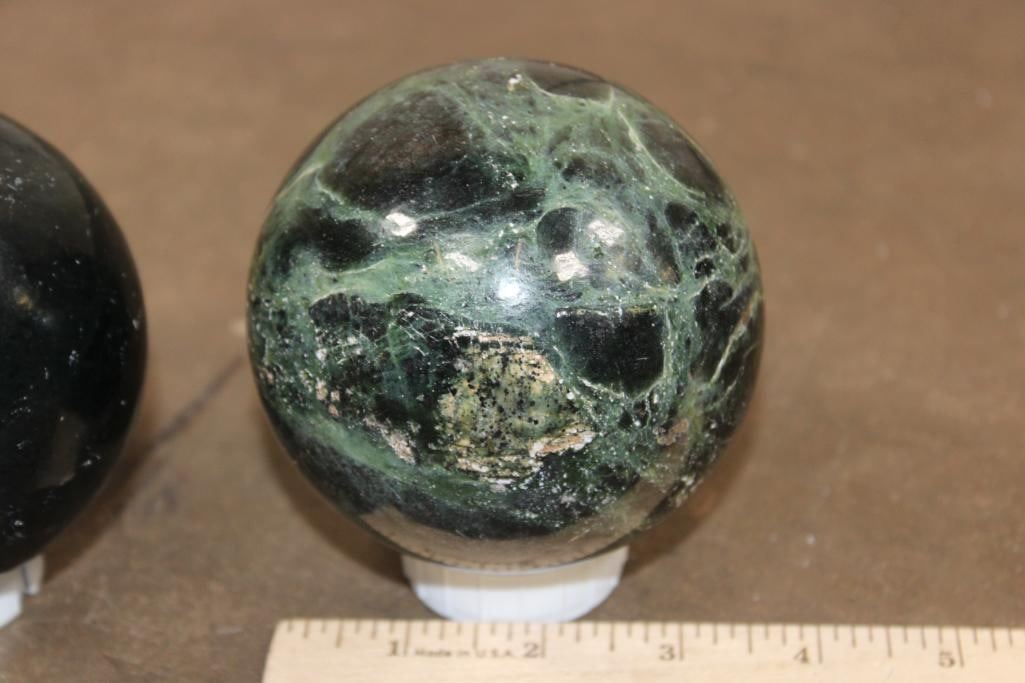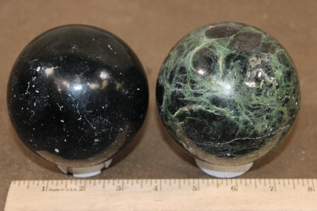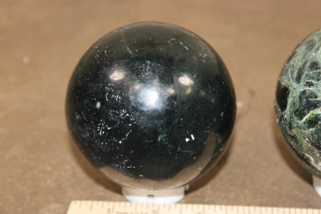 2 Mineral Spheres. Pictured left is the BLACK TOURMALINE Sphere. It measures 3.75" in Diameter and Weighs 2 lbs 10 oz. Pictured left is the Rich GREEN APATITE mineral Sphere. It measures 3.75" in Diameter and Weighs 2 lbs 10 oz. Black Tourmaline is a powerful grounding stone known for its protective properties against negative energy and electro-magnetic radiation. Green Apatite is believed to be a powerful stone for emotional healing. It promotes compassion and the ability to give and receive love. (ONE$) ROCKS MINERALS FOSSILS SPHERES