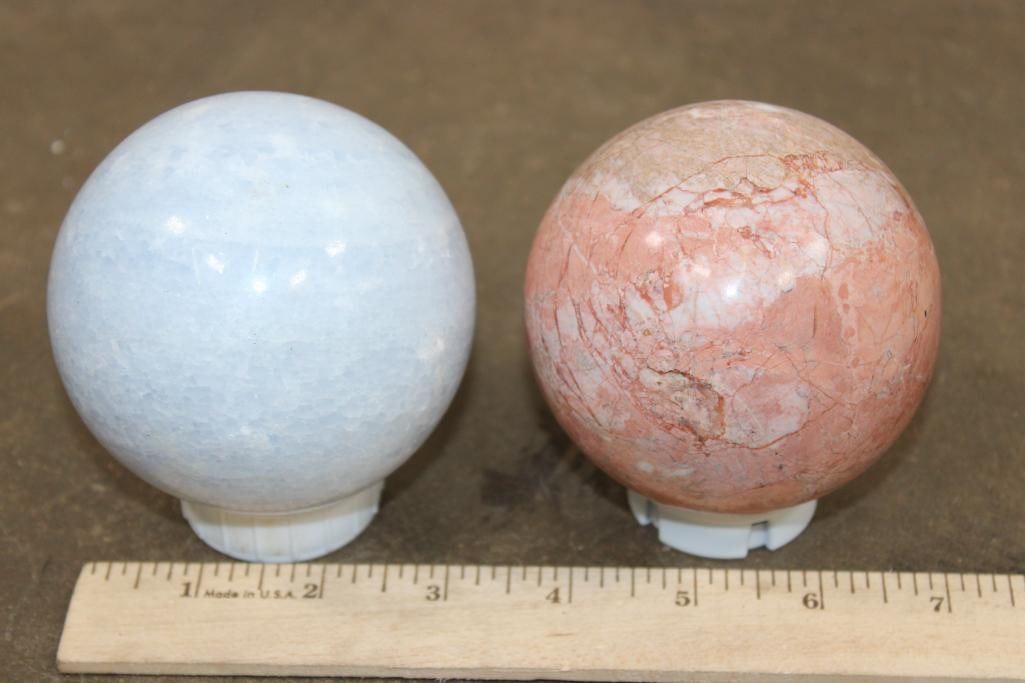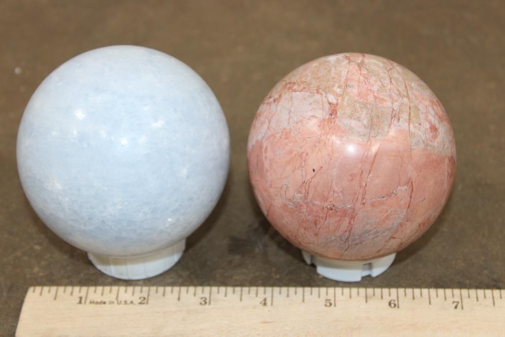 2 Mineral Spheres. Pictured left is the BLUE CELESTITE Mineral Sphere. It measures 3.5" in Diameter and Weighs 2 lbs 1 oz. Pictured right is the PEACH MOONSTONE Mineral Sphere. It measures 3 3/8" in Diameter and Weighs 1 lb 15 oz. Blue Celestite is a crystal associated with divine connection, spiritual clarity, and tranquility. Peach Moonstone is known for its gentle and soothing energy, particularly beneficial for emotional balance and healing. (ONE$) ROCKS MINERALS FOSSILS SPHERES