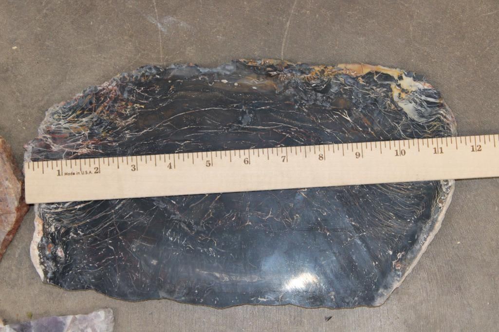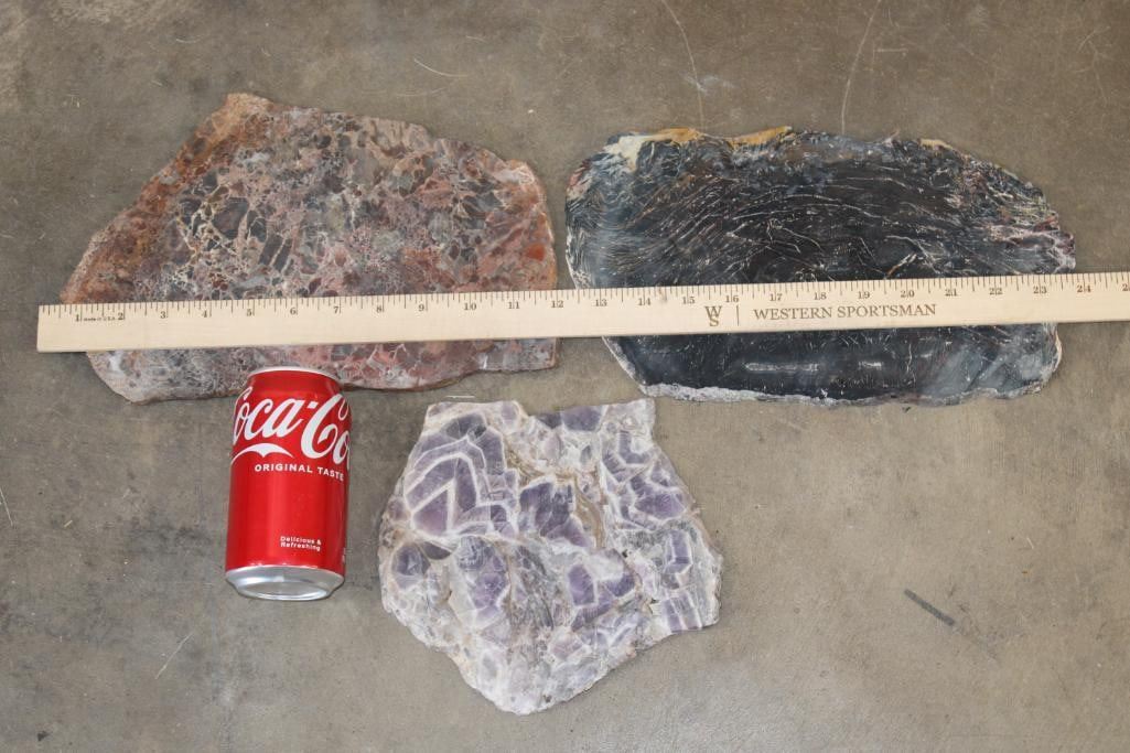 3 Mineral Slab Slices. There is 1 Brecciated Jasper, 1 Petrified Fossilized Wood, and 1 Dream Amethyst Mineral Slice. The Total Weight is 5 lbs. (ONE$) ROCKS FOSSILS MINERALS