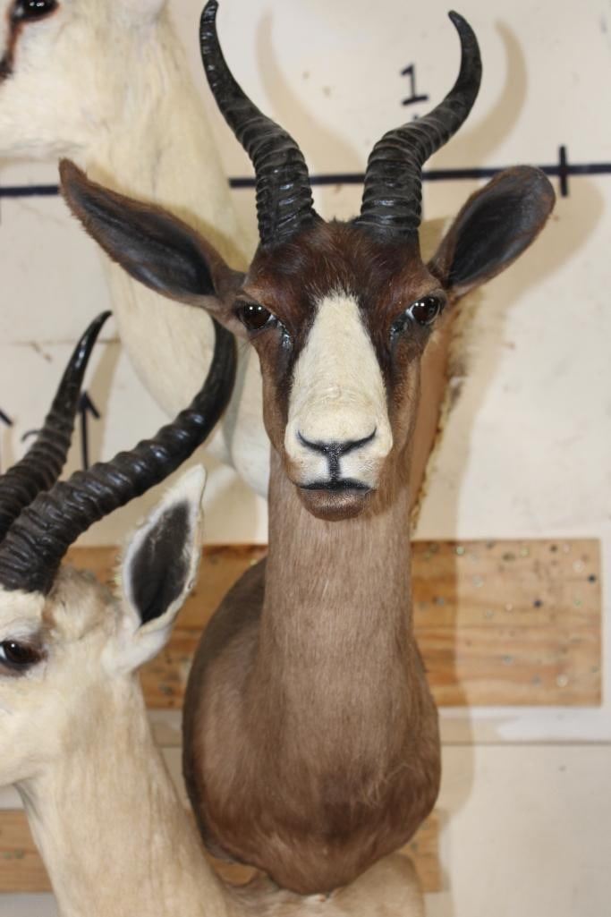 Very Nice, Newer, and Clean 3 Springbok Wooden Pedestal Mount. 1 Common SPRINGBOK, 1 Chocolate SPRINGBOK, and 1 White SPRINGBOK on a Rustic Wood Pedestal. The Springboks are Removable and the Base has Wheels. The Total Mount measures 6' 11" Tall x 19" Long x 19" Wide. It is in Good Condition. TAXIDERMY
