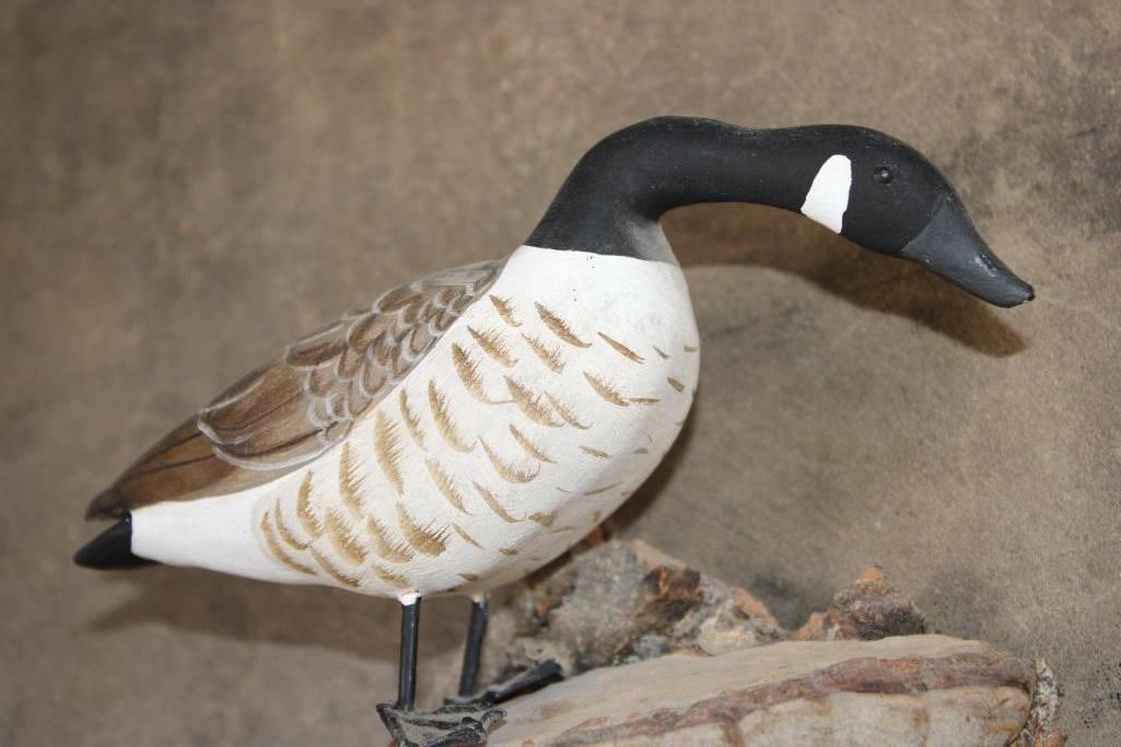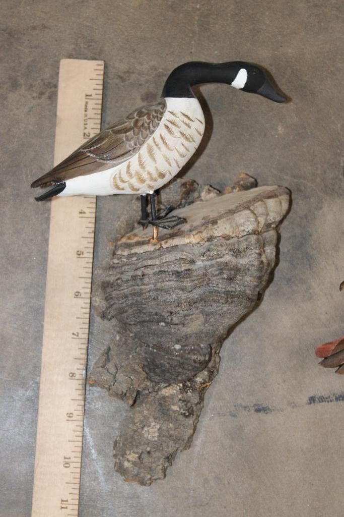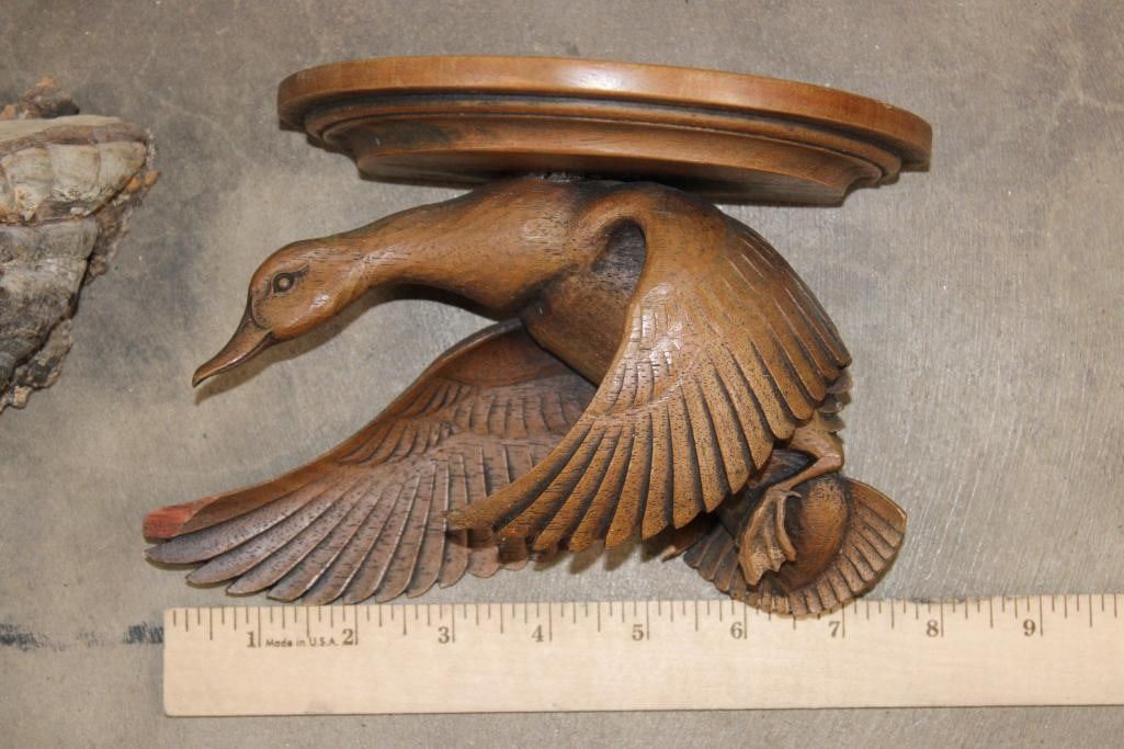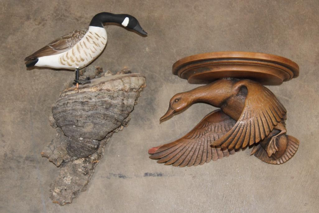 1 Hand-carved and painted wooden CANADIAN GOOSE sculpture on a real tree base. It measures 10.5" Tall x 6.25" Wide x 3" Depth (from the wall) and Weighs 11 oz. 1 Hand-carved wooden DUCK Shelf. It measures 7.75" Long x 4" Wide x 5.25" Depth (from the wall) and Weighs 9 oz. (ONE$) ART CARVINGS AND STATUES