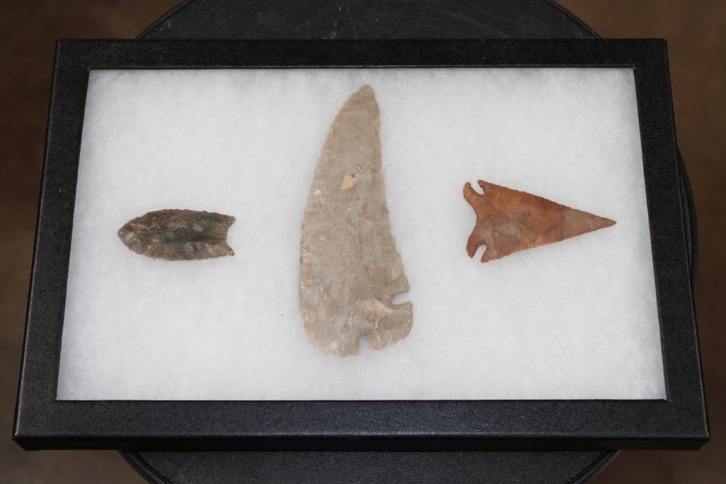 1 Incredible Texas Corner Tang Knife Point that measures 5.5" Long. 1 Clovis Point ARROWHEAD and 1 Pelican ARROWHEAD. They have been displayed in a 12" Long x 8" Wide Display Case with Glass. (ONE$) ARROWHEADS