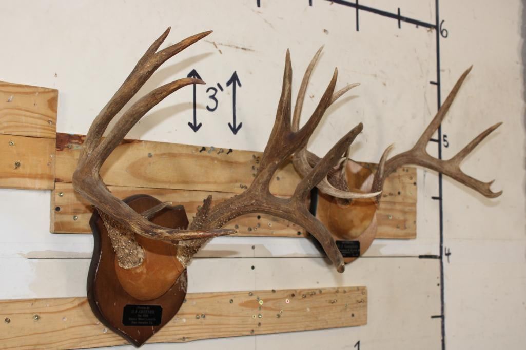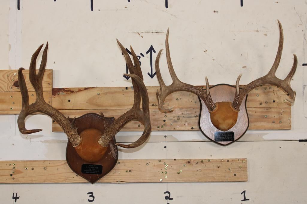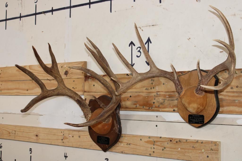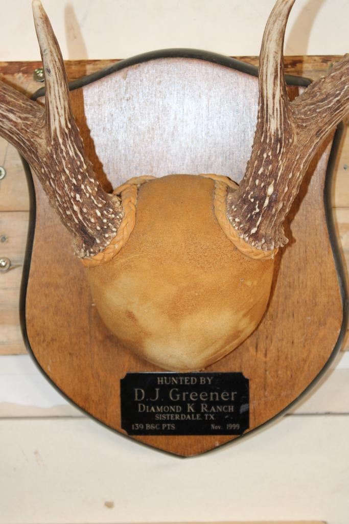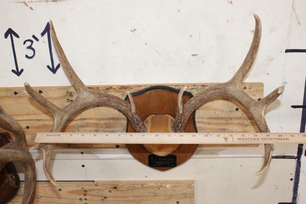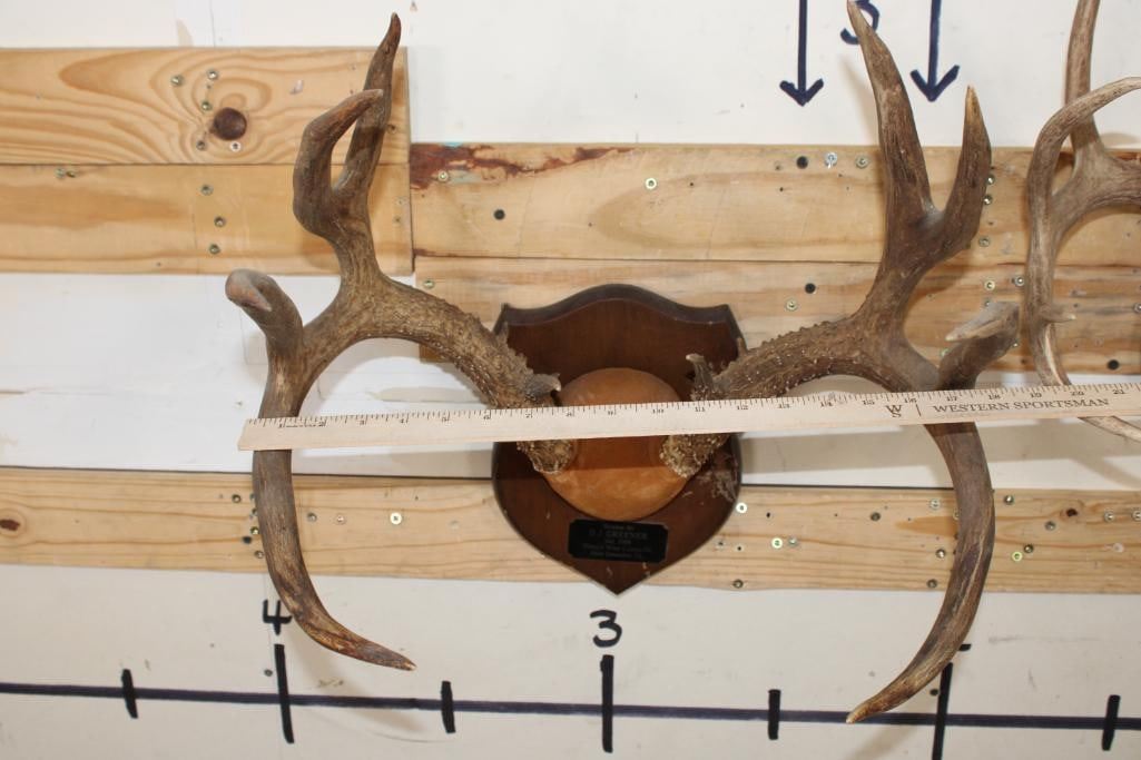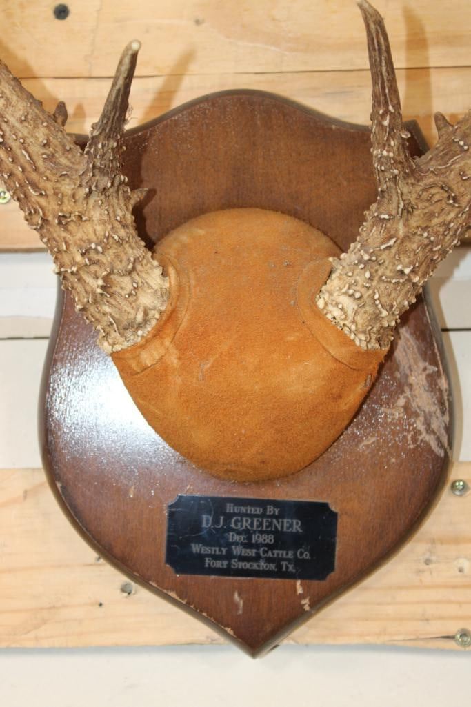 2 Respectable Antler Racks mounted on wooden plaques. 1 MULE DEER Antler Rack Taken December 1988 at Westly West Cattle Co. in Fort Stockton, TX and 1 WHITETAIL DEER Antler Rack Taken at Diamond K. Ranch Sisterdale, TX November 1999. The Whitetail scored 139 Boone and Crockett Points. (ONE$) TAXIDERMY