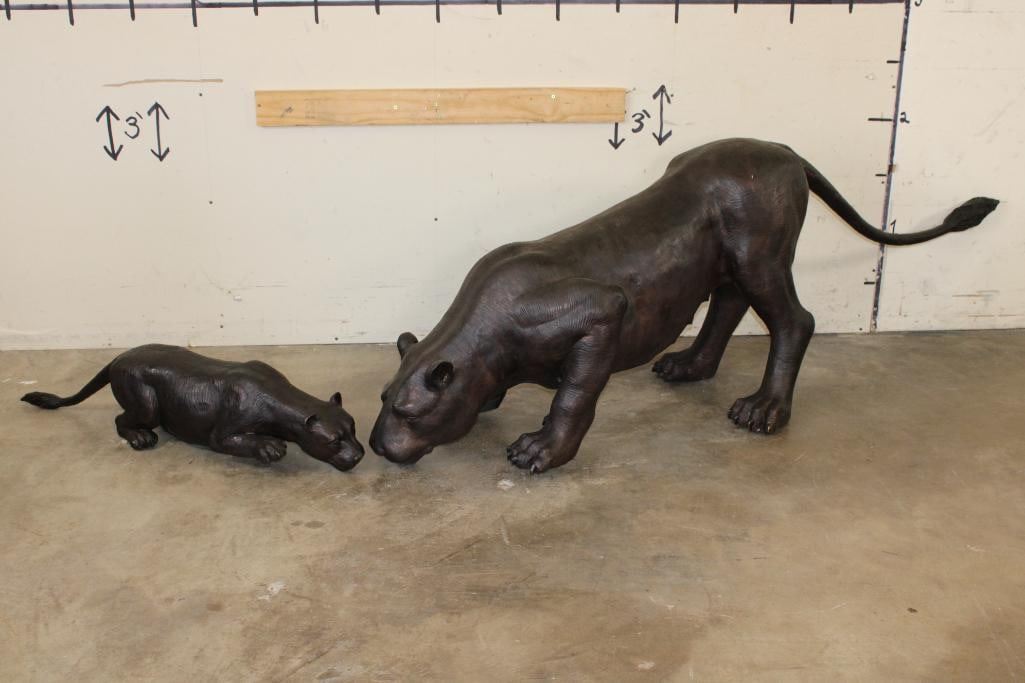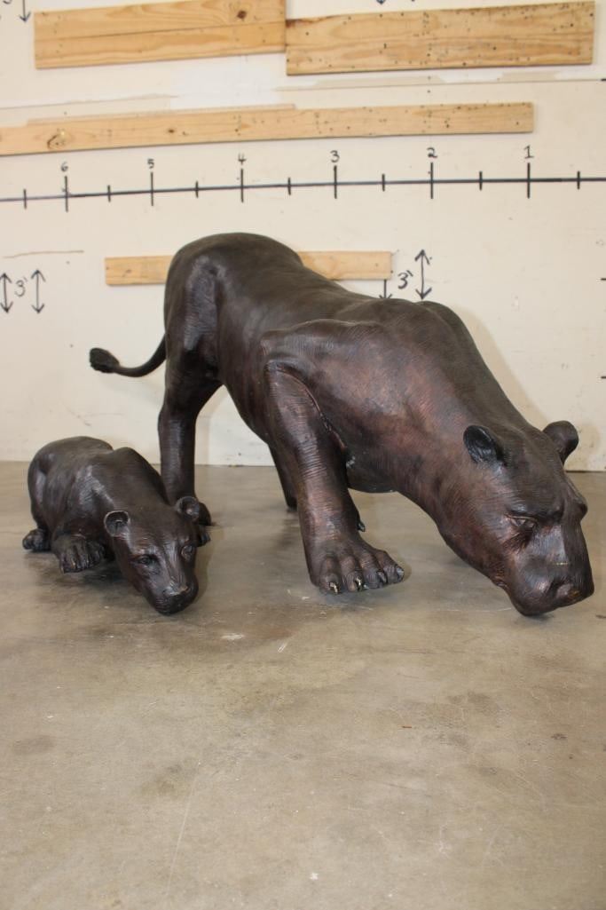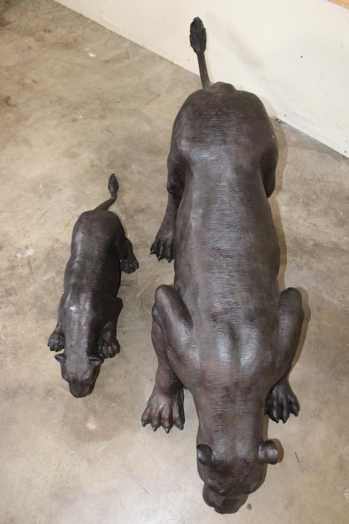 XXL Mother LIONESS with her LION CUB Bronze Sculptures. The Lioness measures 6' 2" Long x 20" Wide and Weighs approximately 97 lbs. The Cub measures 37" Long x 10" Wide x 8" Tall and Weighs 17 lbs 10 oz. (ONE$) COLLECTIBLE BRONZE ART SCULPTURES AND STATUES