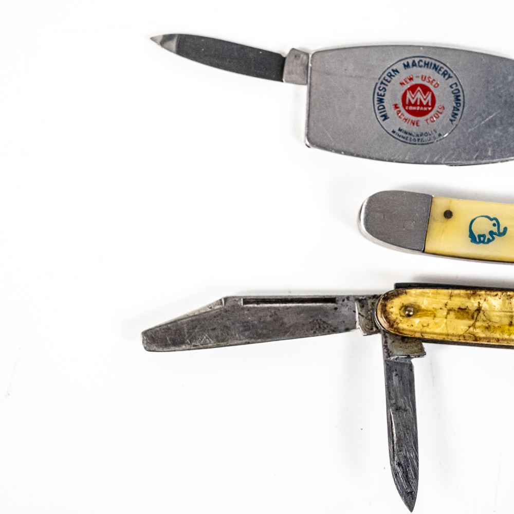 10 Advertising or giveaway knives. Assorted styles and vintages of knives that were given away as gift or rewards from businesses or events. Condition varies from good to brand new. Nice instant collection of old collector knives. 2.5-4" closed length. See photos.