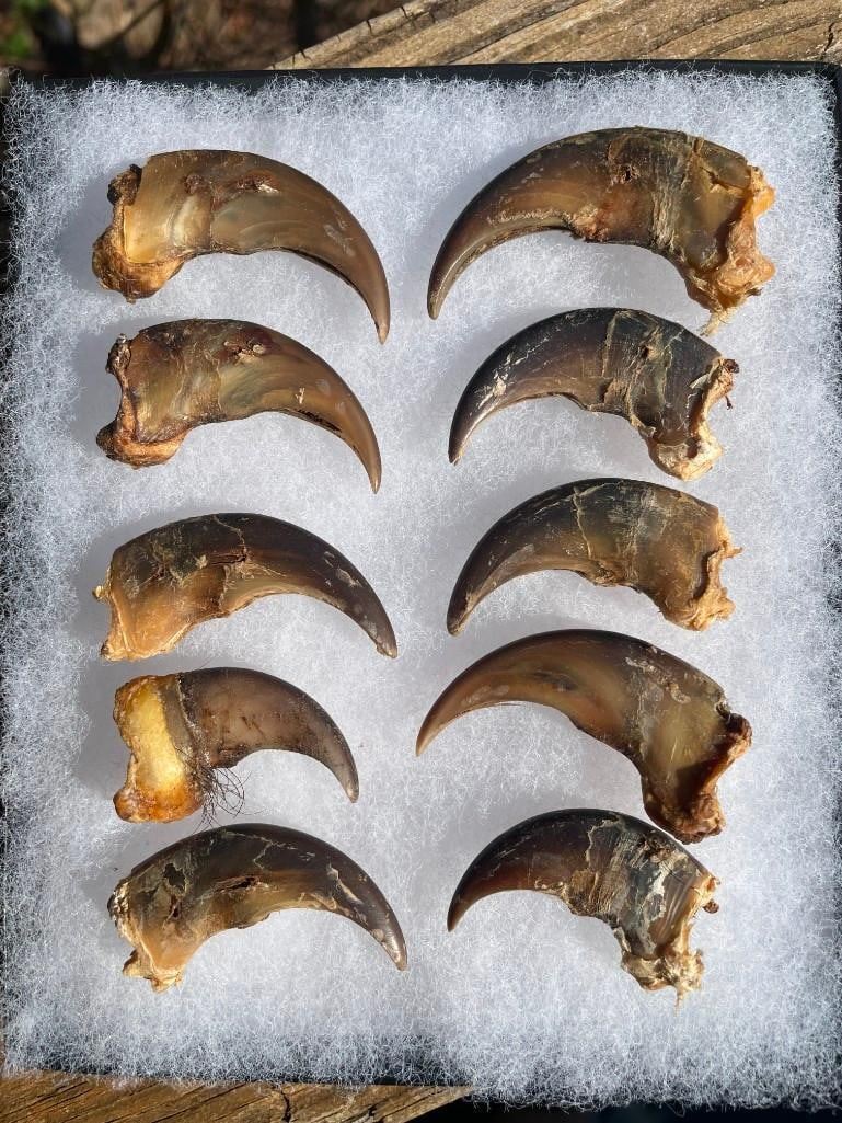 10 BLACK BEAR Front Claws in a Glass Display Case. The Glass Case measures 6.25" Long x 5.25" Wide. Great for Native American crafts! These could be used for necklace pendants or added to belt buckles with resin. (ONE$) TAXIDERMY