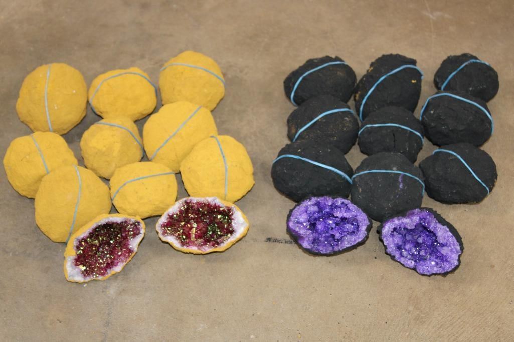 20 Crystal Quartz Geodes. There are 10 Dyed Purple Crystal Quartz Geodes and 10 Titanium Aura Green Geodes. The Total Weight is 7 lbs 15 oz. The core of the aura quartz is natural clear quartz crystal that has been heat treated in a lab and iridescent coated with metal to achieve the affect. (ONE$) ROCKS FOSSILS MINERALS CRYSTALS