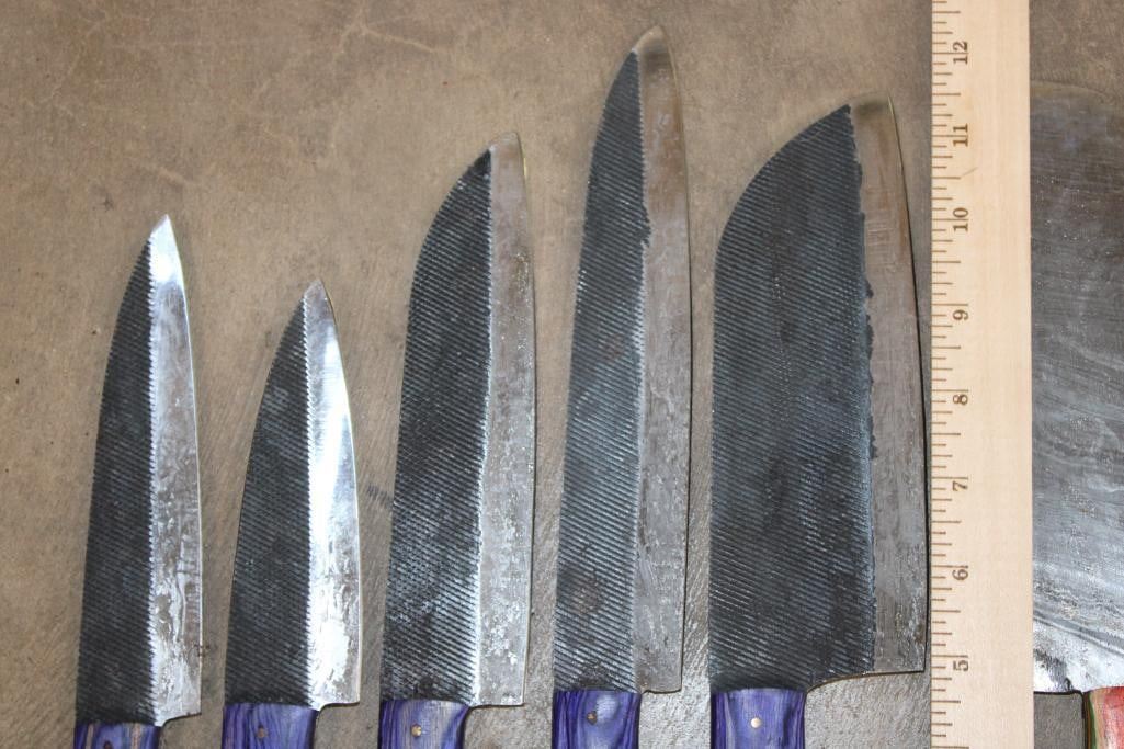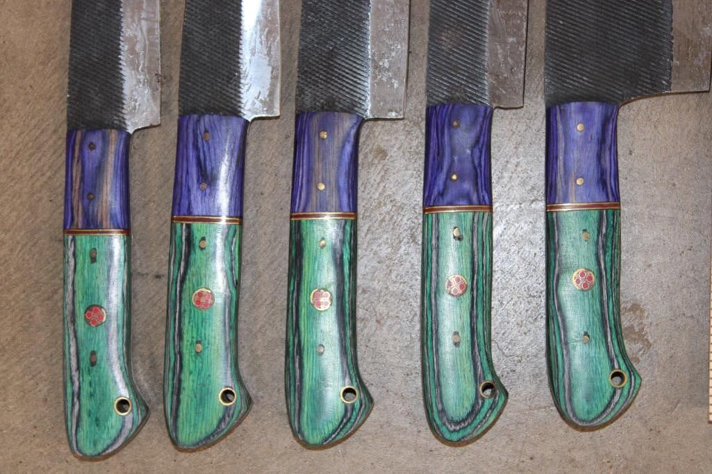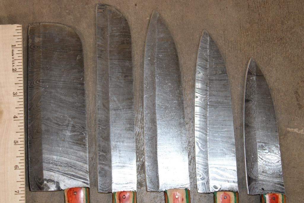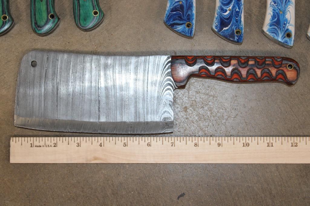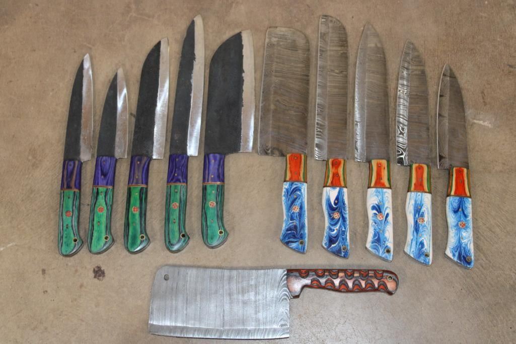 10 *New* Damascus Steel Chef KNIVES. 1 set of Chef Knives have green and blue wooden handles the other set has blue and red/multicolor wooden handles. The Damascus Steel Butcher Knife handle is multicolor wood. COOKING AND KITCHEN KNIVES