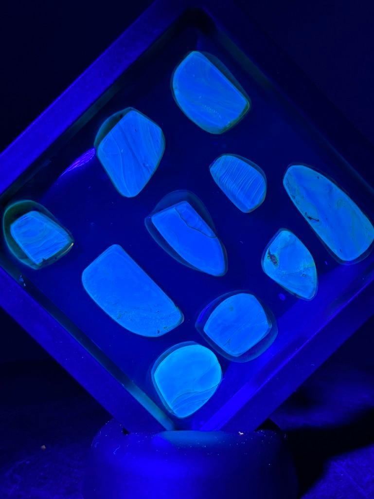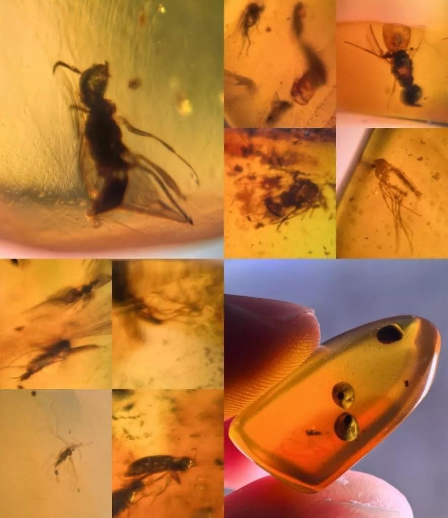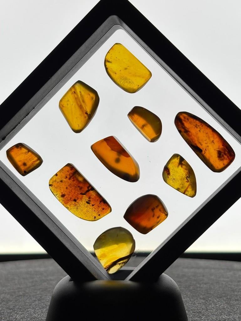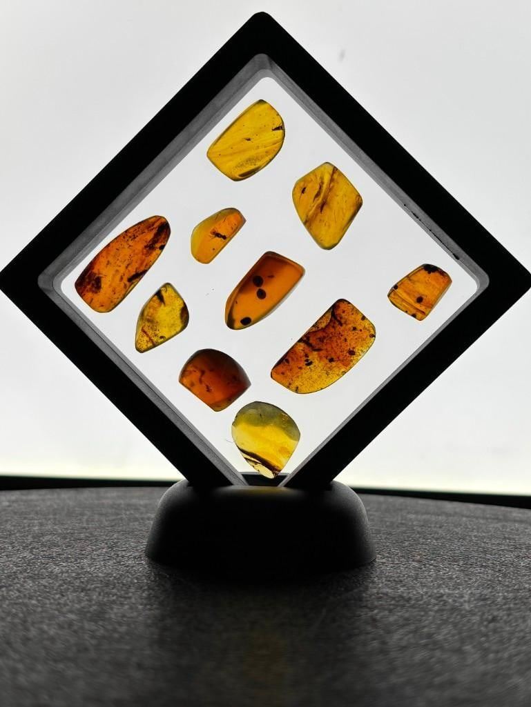10 Pieces of Authentic Myanmar AMBER with Insect Specimens inside. These were mined in Burma. They have been tested and are UV Light Reactive. The display case shown is included. (ONE$) ROCKS MINERALS FOSSILS