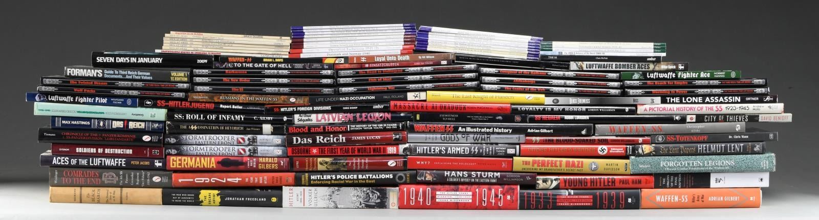 Books include, but not limited to: "Loyalty is My Honor" by Gordon Williamson. "Black Edelweiss: A Memoir of Combat and Conscience by a Soldier of the Waffen-SS" by Johann Voss. Chronicle of the 7. Panzer-kompanie" by Ralf Tiemann. "SS Hitlerjugend: The History of the 12th SS Division 1943 - 1945" by Rupert Butler. "Blood & Honor: The History of the 12th SS Panzer Division" by Craig Luther. Himmler's Bosnian Division : The Waffen-SS Handschar Division 1943-1945" by George Lepre. "Deutschalands Waffengefahrten an der Ostfront 1941-1945" by Peter Gosztony. "Forman's Price Guide to Third Reich German Documents. and Their Values - Volume 1". "Hans Sturm: A Soldier's Odyssey on the Eastern Front" by Gordon Williamson. "Russians in the Waffen-SS" by Rolf Michaelis. "SS Einsatzgruppen: Nazi Death Squads, 1939-1945" by Gerry van Tonder. "Hitler's Armed SS: The Waffen-SS at War, 1939-1945" by Anthony Tucker-Jones. 13 Book Series by Life-Time "The Third Reich". CONDITION: books are in good overall condition showing wear commensurate w/ light use. A few books show library tags. Some show previous owner's marks. Balance of pages are very good. (02-19630-2/MD).$200-450.