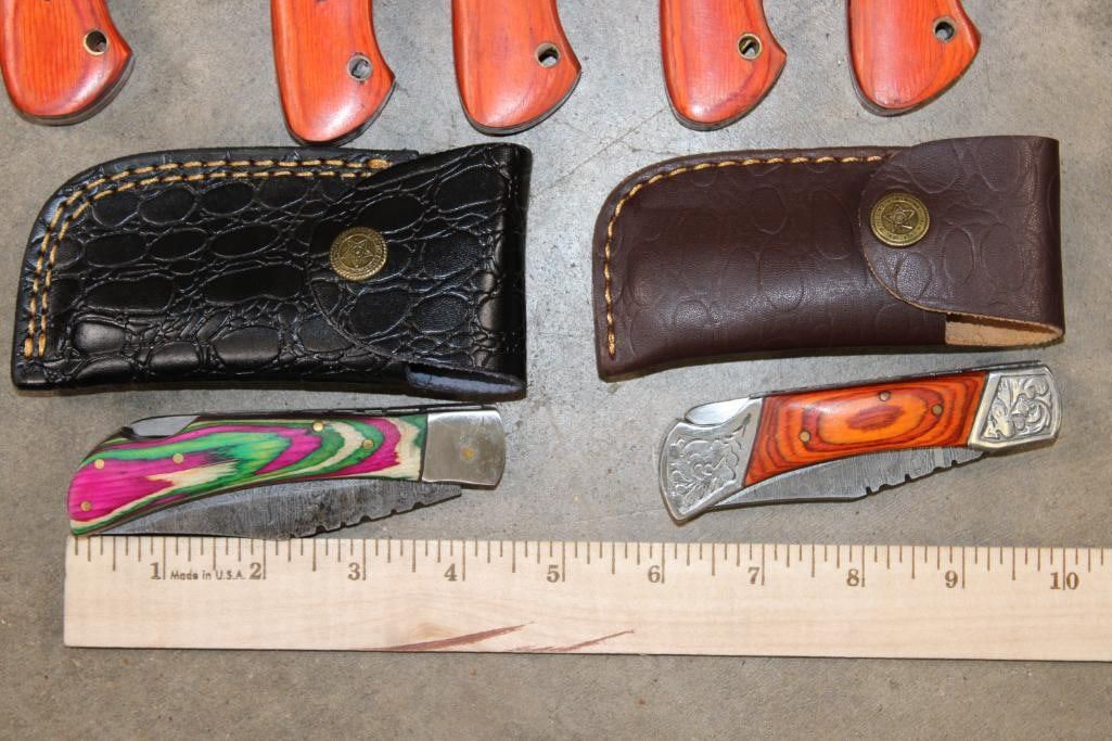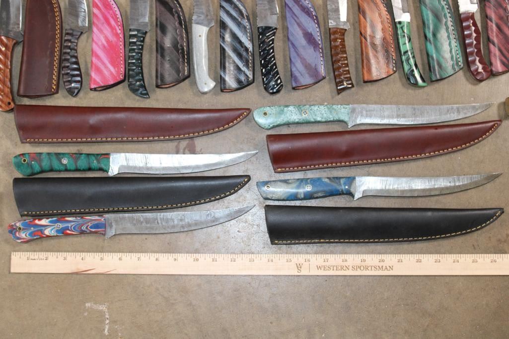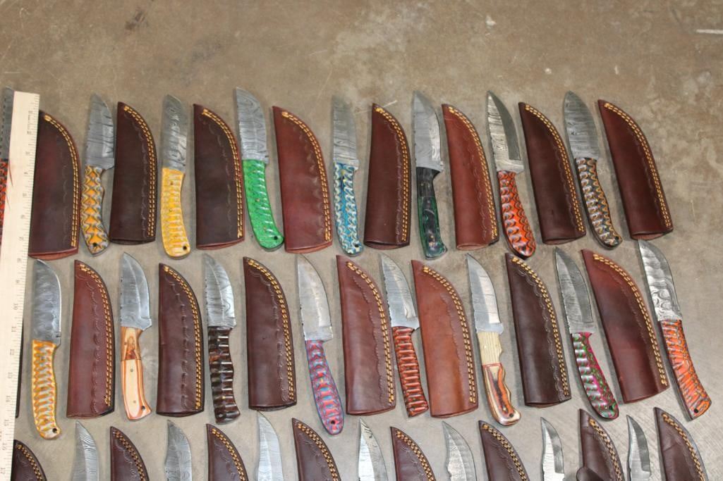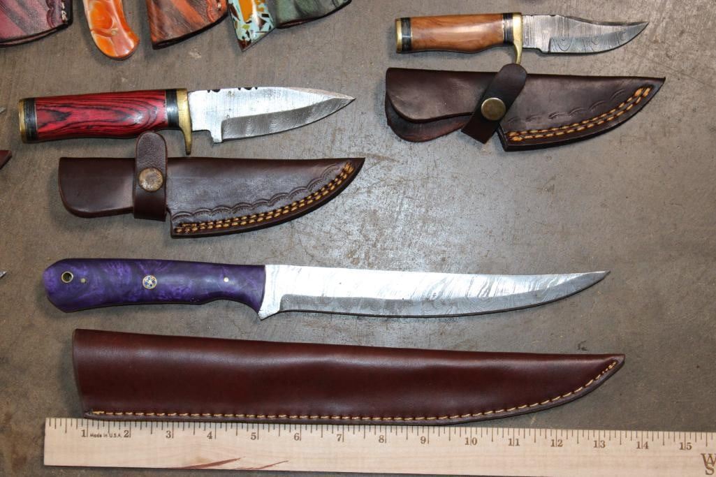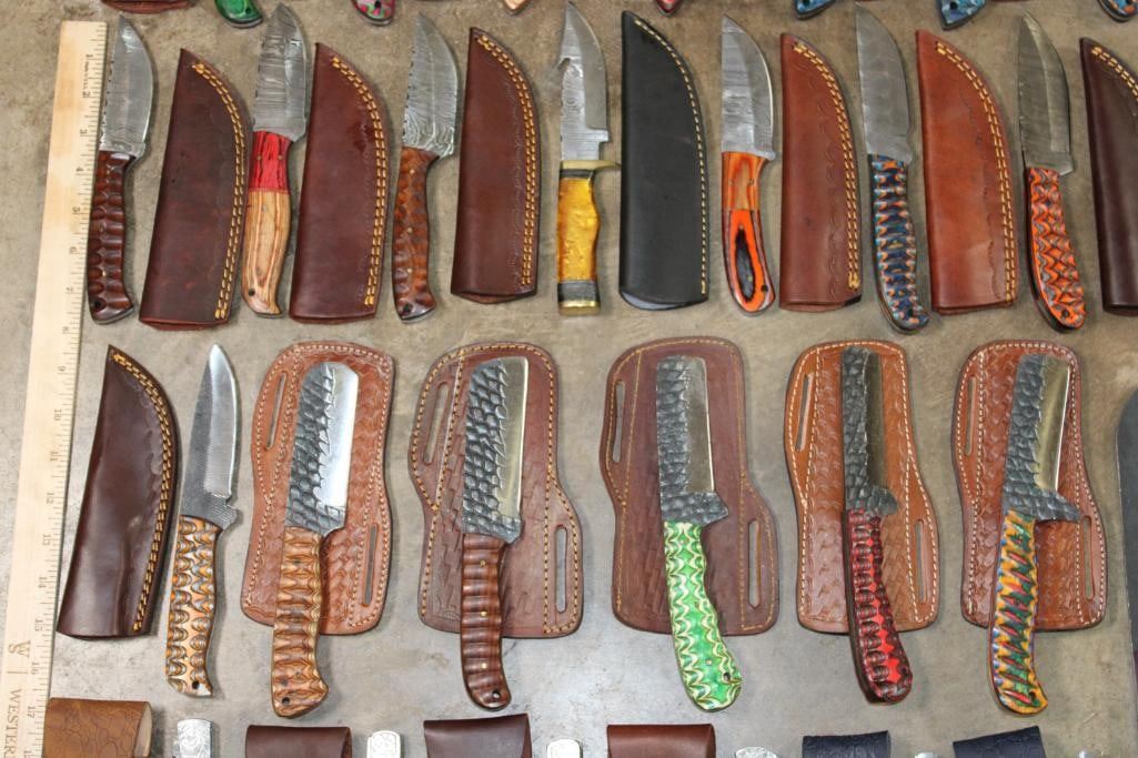 100 *New* Damascus Steel and Carbon Steel Knives. 79 Damascus Steel Knives including 5 Big Filet Knives with Leather Sheaths. 10 Damascus Steel Folding or Pocket Knives with Leather Sheaths. 11 Fixed Blade Carbon Steel Knives including a set of 5 matching Chef Knives (no Sheaths). (ONE$) HUNTING AND COOKING KNIVES