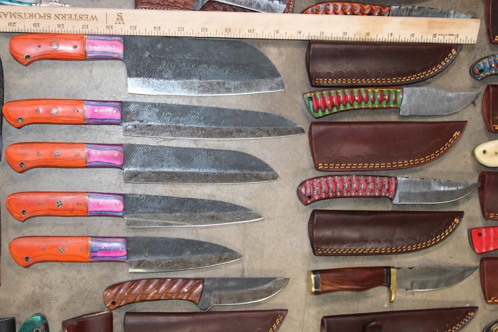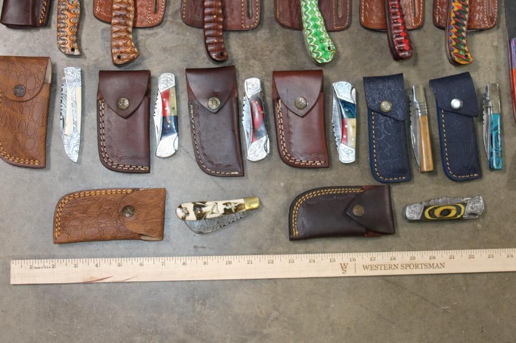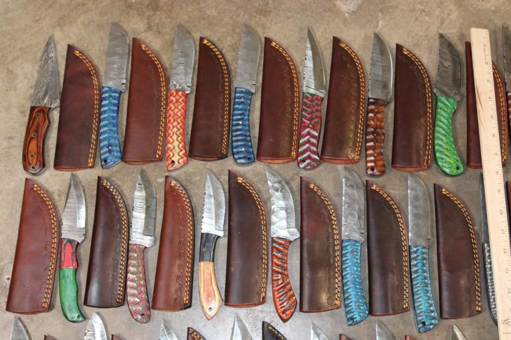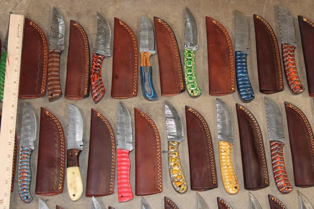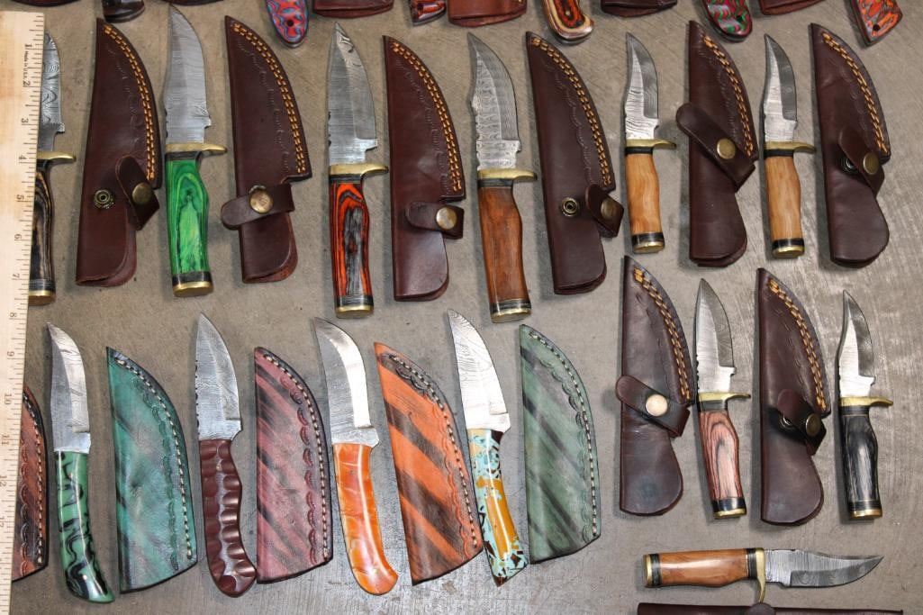 100 *New* Damascus Steel and Carbon Steel Knives. 79 Damascus Steel Knives including 5 Big Filet Knives with Leather Sheaths. 10 Damascus Steel Folding or Pocket Knives with Leather Sheaths. 11 Fixed Blade Carbon Steel Knives including a set of 5 matching Chef Knives (no Sheaths). (ONE$) HUNTING AND COOKING KNIVES