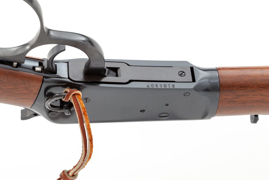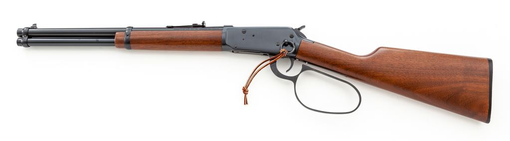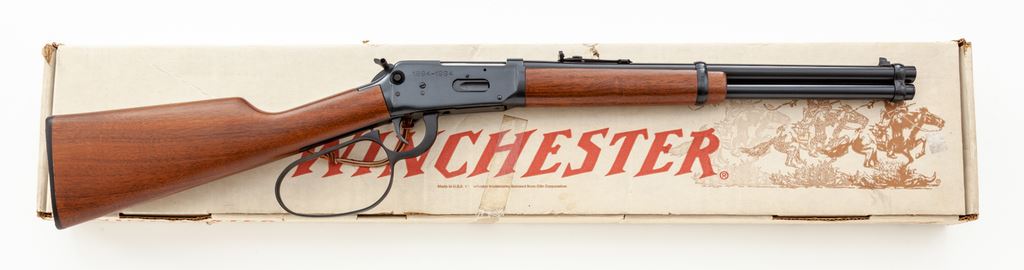 100-Year Anniversary Winchester Model 94AE Lever Action Wrangler Carbine, #6106907, side ejection, .30-30 cal., 16'' round barrel, blue finish; right side of receiver marked ''1894-1994''. The straight grip walnut stock with black composition Winchester buttplate. Rifle also features a large loop lever, dovetailed blade front sight, sporting elevator rear sight, with saddle ring; hammer with spur extension. In original box with matching end label and misc. factory paperwork. Condition is excellent with approx. 99%+ factory blue. Metal surfaces with a few slight small scratches. Wood with a half dozen moderate impressions scattered along the wrist and forend. Action is smooth and crisp with an excellent shiny bore. Box shows moderate storage wear and some mild yellowing from age. Est.: $400-$600. (Modern)