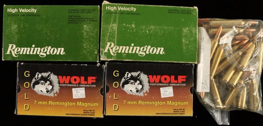Consisting of 40 rounds of Wolf Gold brass case 160 grain pointed soft point boat tail, 40 rounds of Remmington Core-Lokt 150 grain soft point, and 29 rounds of Winchester Super-X pointed soft point ammunition.