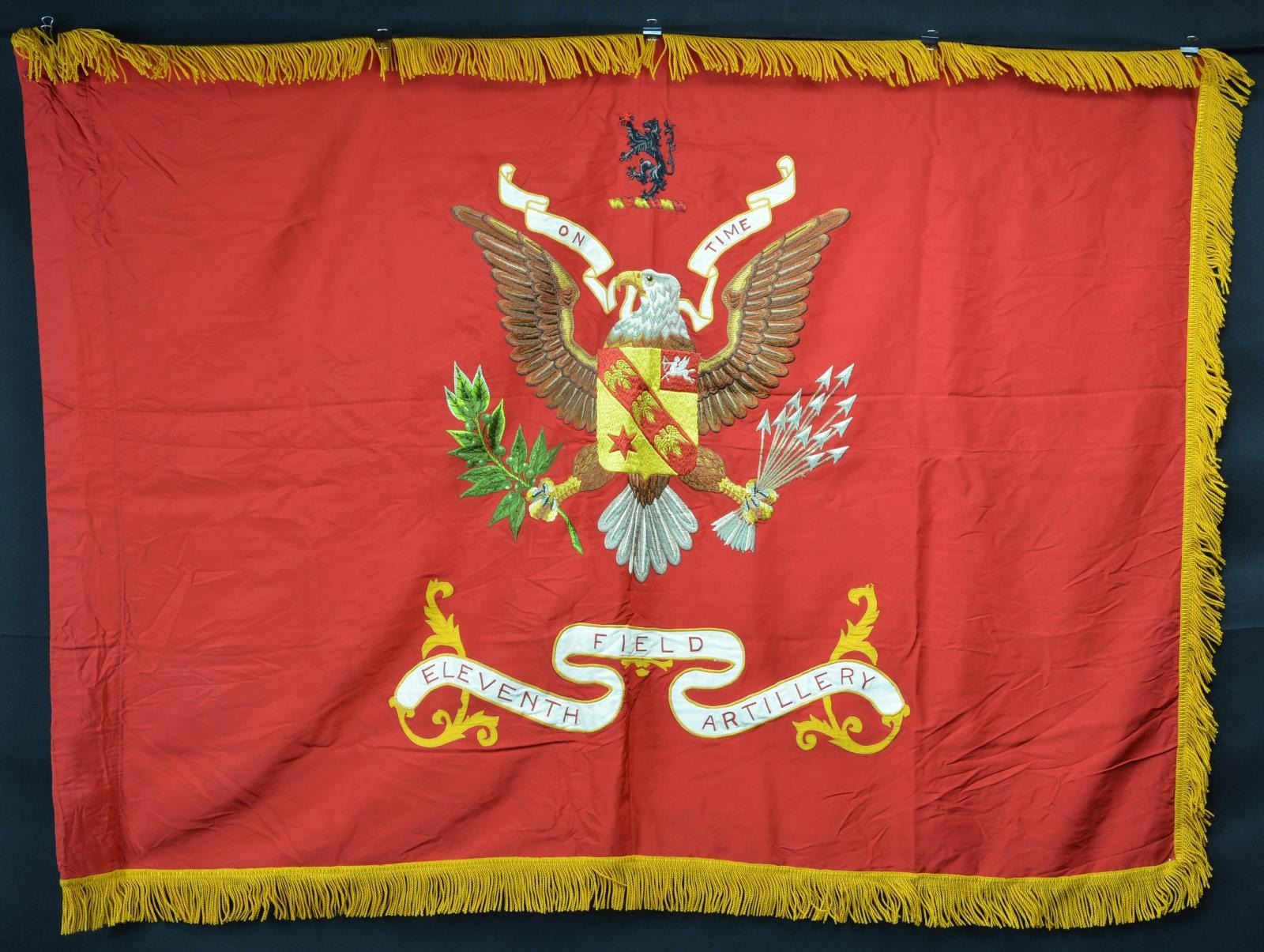 3’ x 4’ double applique embroidered on red field with gold fringe, unit crest and motto “ON TIME”. This unit was redesignated in 1960s for the Vietnam War. Four battalions of the 11th field artillery regiment served in Southeast Asia. The 1st Battalion served with the 9th Infantry Division; 2nd Battalion served with the 101st Airborne Division; another battalion served with the 11th Infantry brigade. Lastly, the 7th Battalion served the 25th infantry division. Lt. Robert Kalsu, NFL Buffalo Bills lineman was killed July 21, 1970 by mortar fire, a member of A battery, 2nd Battalion. The 2nd Battalion, 11th Field Artillery, is currently assigned to the 25th Infantry Division (Light). It is the only unit of this regiment that remains. The regimental flag is scarlet, the traditional color for American artillery units since the Corps of Artillery of the Continental Army was formed in 1777. The scarlet trim of their uniforms was matched with a plum on their hats of the same color. In the center of the Eagle is the regimental crest and on the ribbon in its beak is their motto, “On Time.” This regiment has a long lineage (1916-1958) prior to this flag’s Vietnam era manufacture and Philadelphia QM issue. The 11th Field Artillery Regiment was constituted in June 1916 in the Regular Army at Camp Douglas. Two months after the United States declared war, 10 officers and 200 enlisted men of the 6th Field Artillery were transferred to the newly formed 11th Field Artillery at Camp Jones near Douglas, Arizona. The unit was supplemented by draftees from New York, Ohio, Missouri and California. At full wartime strength, the 11th had 63 officers, 1496 enlisted, and 24 guns. In April 1918, the 11th was ordered to Fort Sill in Oklahoma where it became part of the 6th Field Artillery Brigade, 6th Division. The regiment was shipped to England in July 1918 and fought in the Meuse-Argonne Offensive seeing its first action on the night of October 26 at Rémonville and participating in the largest artillery barrage of the war on November 1st. On November 6th, the guns of the 11th's Battery E were the first Allied artillery pieces to fire on the rail line between Metz and Sedan and managed to silence a German battery some 3,000 yards away. Battery E, which had become separated from the rest of the regiment and was situated east of Beaufort, was accorded the honor of firing the final shot of World War One. That shot, a 95-pound shell, was fired at 10:59:59 AM on November 11th, 1918 by a 155mm howitzer at an unknown target (probably the Metz-Sedan railway). The regiment was relieved in November 1920 from assignment to the 6th Division and on March 1st was assigned to the Hawaiian Division (later designated the 24th Infantry Division). The regiment was relieved in March 1958 from assignment to the 24th Infantry Division. CONDITION: fine overall. (02-19473-4/JS). $300-400.