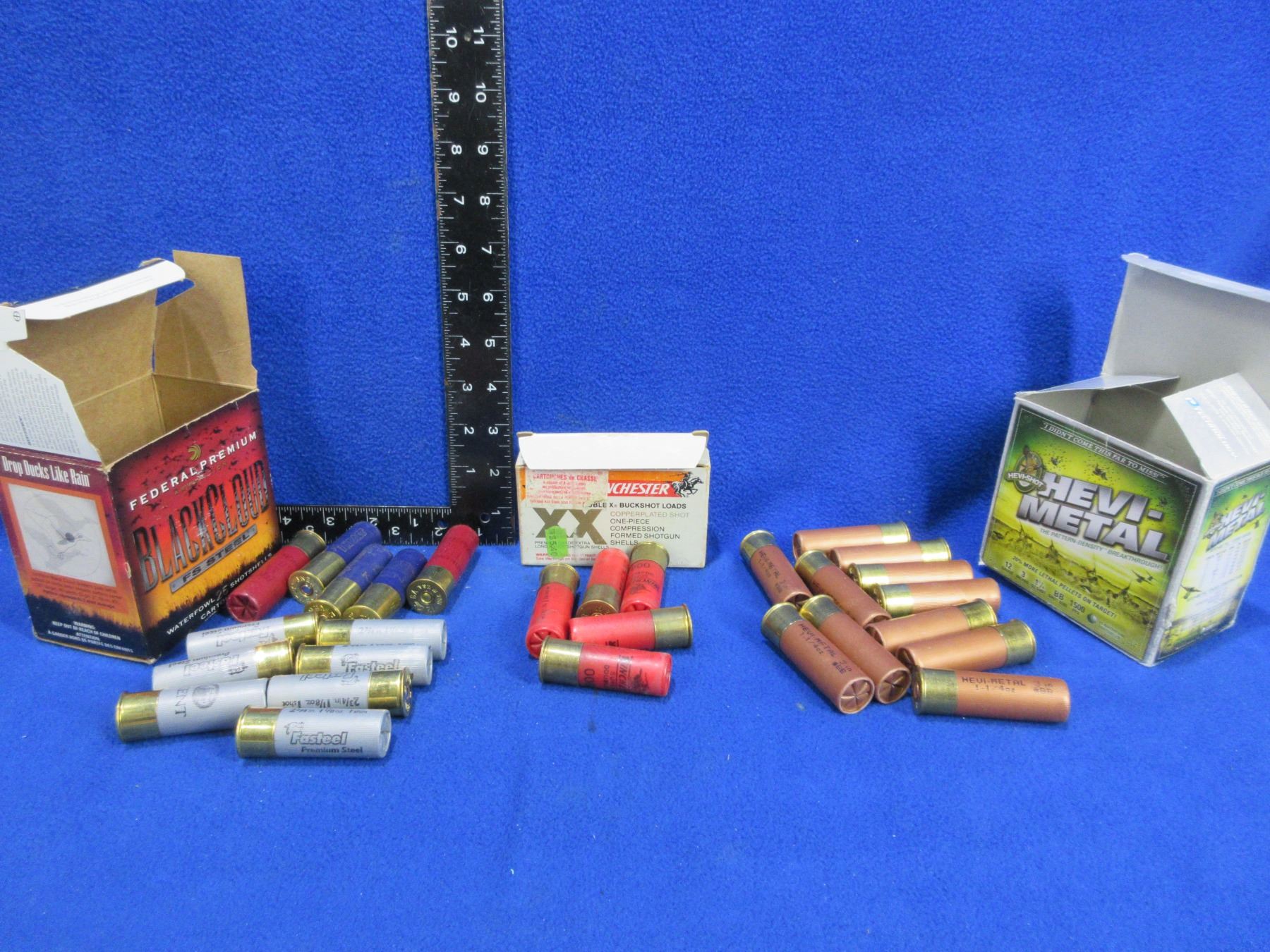 12 Ga. 2 3/4" and 3" Mixed Shotshells (Pick Up or Ship by UPS Only) - Box of 11 (Hevi-Metal 3" Bb Shot), Box of 12 (Mixed 2 3/4"), Box of 5 (Winchester 2 3/4" Copperplated 00Buck)