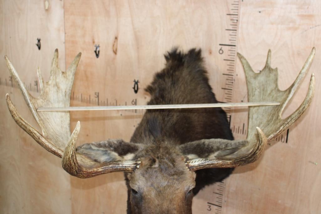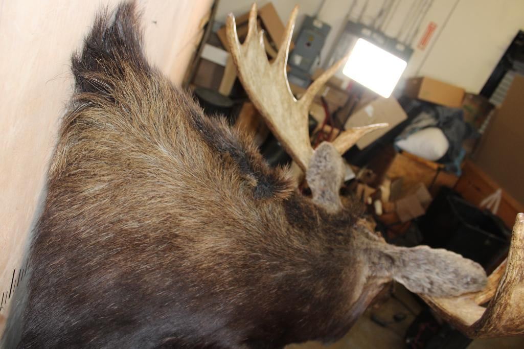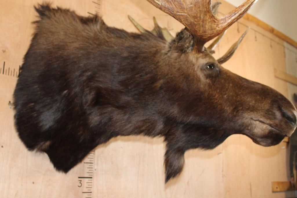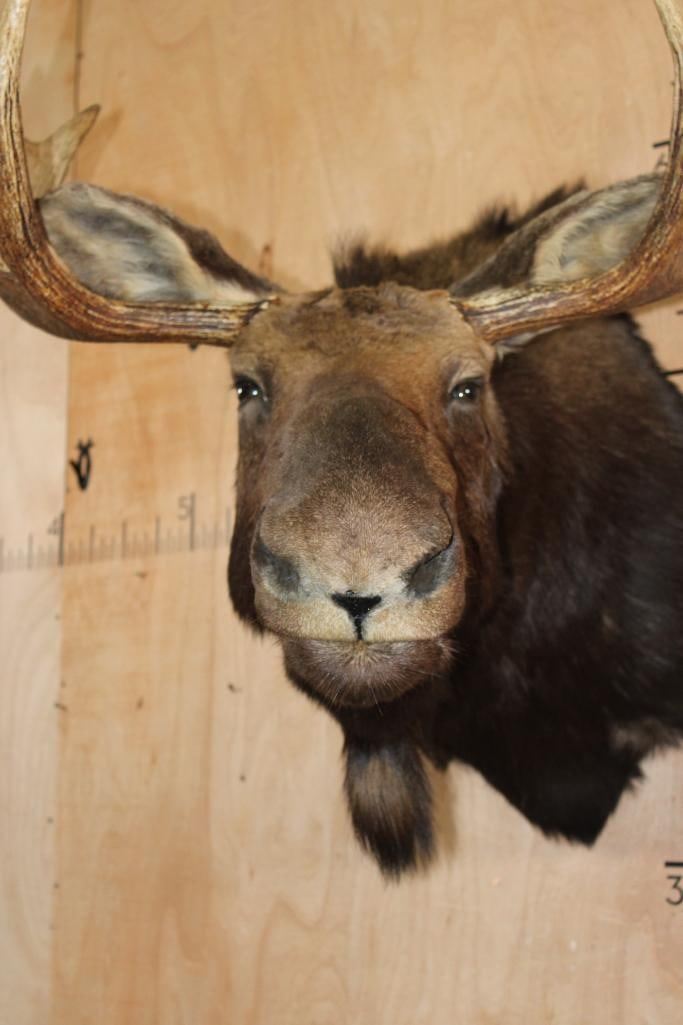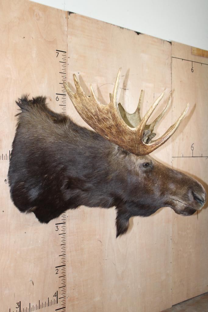 Very Nice and Clean 12-Point SHIRAS MOOSE Shoulder Mount. It has a 44" Spread and is in Very Good Condition. The Shiras Moose or "Wyoming Moose" is the smallest of the four North American moose subspecies, typically weighing 507-1,080 lbs and standing about 6' Tall at the shoulder. TAXIDERMY
