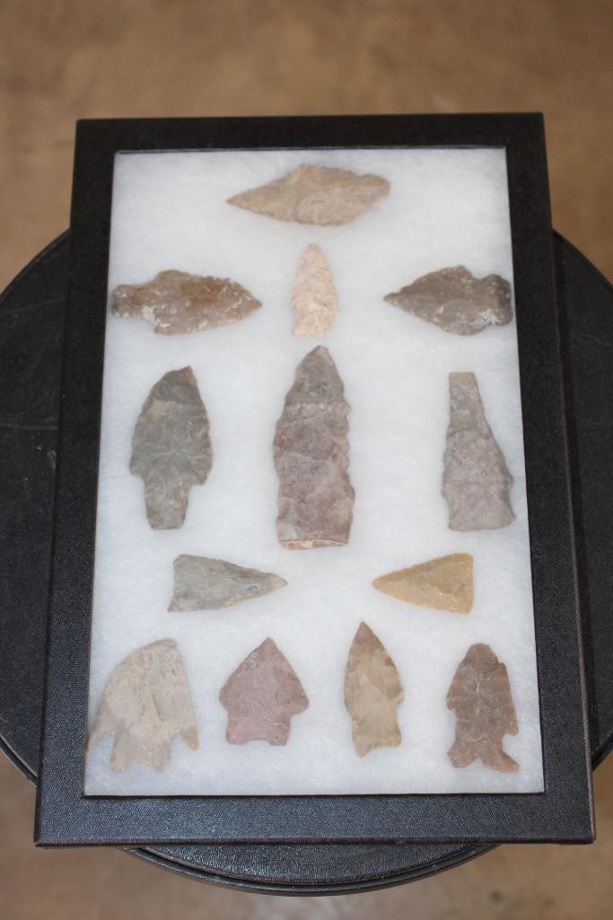 12 Prehistoric South Texas Flint ARROWHEADS beginning 3000 BC. The Arrowheads measure 1.5" to 3 3/8" Long. They have been displayed in a Case with Glass that measures 12" Long x 8" Wide. (ONE$) ARROWHEADS