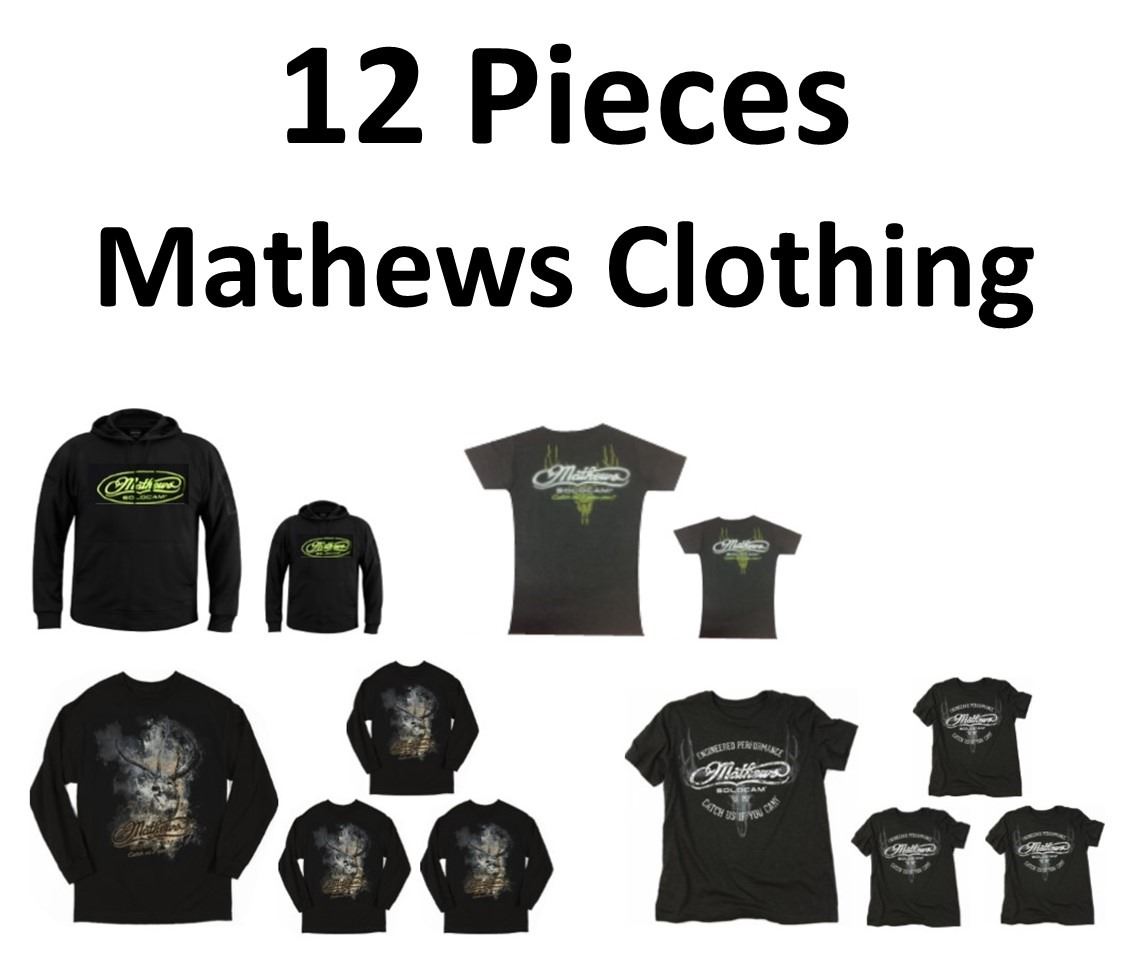 12 x Mathews Clothing, 2 x Hoodie Green Logo, 1-XL, 1-L, 10 x Shirts, 2-Charcoal Neon Green XL, 2-Elusive L, 2-Elusive XL, 2-Outfitter M, 2-Outfitter L
