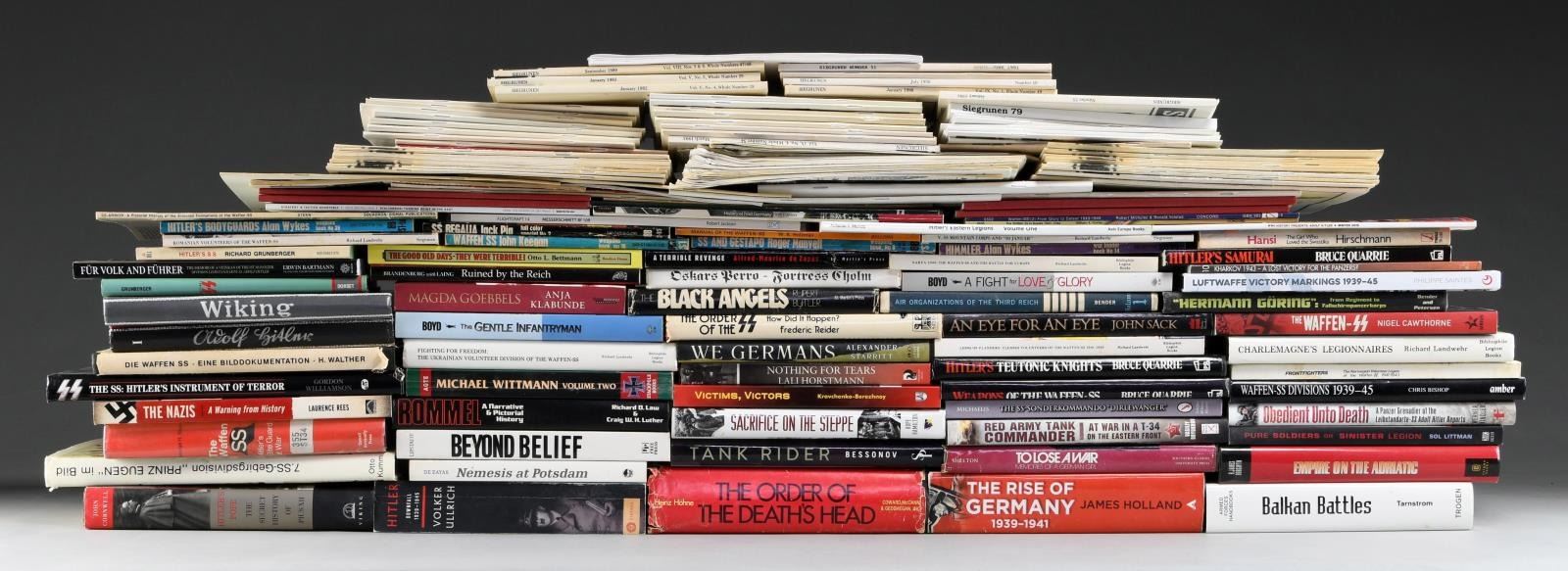 PRIMARILY ABOUT GERMANY DURING WWII. Books include, but not limited to: "SACRIFICE ON THE STEPPE : The Italian Alpine Corps in the Stalingrad Campaign". by Hope Hamilton. "Obedient unto Death : A Panzer-Grenadier of the Leibstandarte-SS Adolf Hitler Reports" by Wener Kindler. "The Memoir of a Veteran of the 1st SS Panzer Division Leibstandarte SS Adolf Hitler" by Erwin Bartmann. "Balkan Battles" by Ronald Tarnstrom. "The SS-Sonderkommando "Dirlewanger": A Memoir" edited by Rolf Michaelis. "Luftwaffe Victory Markings 1939-45" by Philippe Saintes. "Hermann Goring: From regiment to fallschirmpanzerkorps" to Roger Bander. Vol. 1 "Air Organizations of the Third Reich" by Roger Bender. "Rommel: A Narrative & Pictorial History" by Richard D. Law. "The Leibstandarte I" Hardbook & Mapbook by Rudolf Lehmann. "Fortress Cholm" by Oskars Perro. "European Volunteers" by Peter Strassner. "7. SS - Gebirgs - Division "Prinz Eugen" im Bild" in German by Kumm Otto. "Charlemagne's Legionnaires: French Volunteers of the Waffen-Ss, 1943-1945" by Richard Landwehr. "Lions of Flanders: Flemish Volunteers of the Waffen-SS 1941-1945" by Richard Landwehr. "Fighting for Freedom: The Ukrainian Volunteer Division of the Waffen-SS" by Richard Landwehr. "Romanian Volunteers of the Waffen-SS: 1944-1945" by Richard Landwehr. "Narva 1944: The Waffen S S and the Battle for Europe" by Richard Landwehr. "Hitler's Eastern Legions Volume I" by Antonio Munoz. "Frontfighters: The Norwegian Volunteer Legion of the Waffen-SS 1941-1943" by Richard Landwehr. 56 Small books & 37 stapled together 3 hole page editions by Siegrunen. CONDITION: books & magazines in good overall condition showing wear & light staining commensurate w/ use. Pages appear good to very good w/ some example's signed by author. (02-19630-4/MD). $550-800.