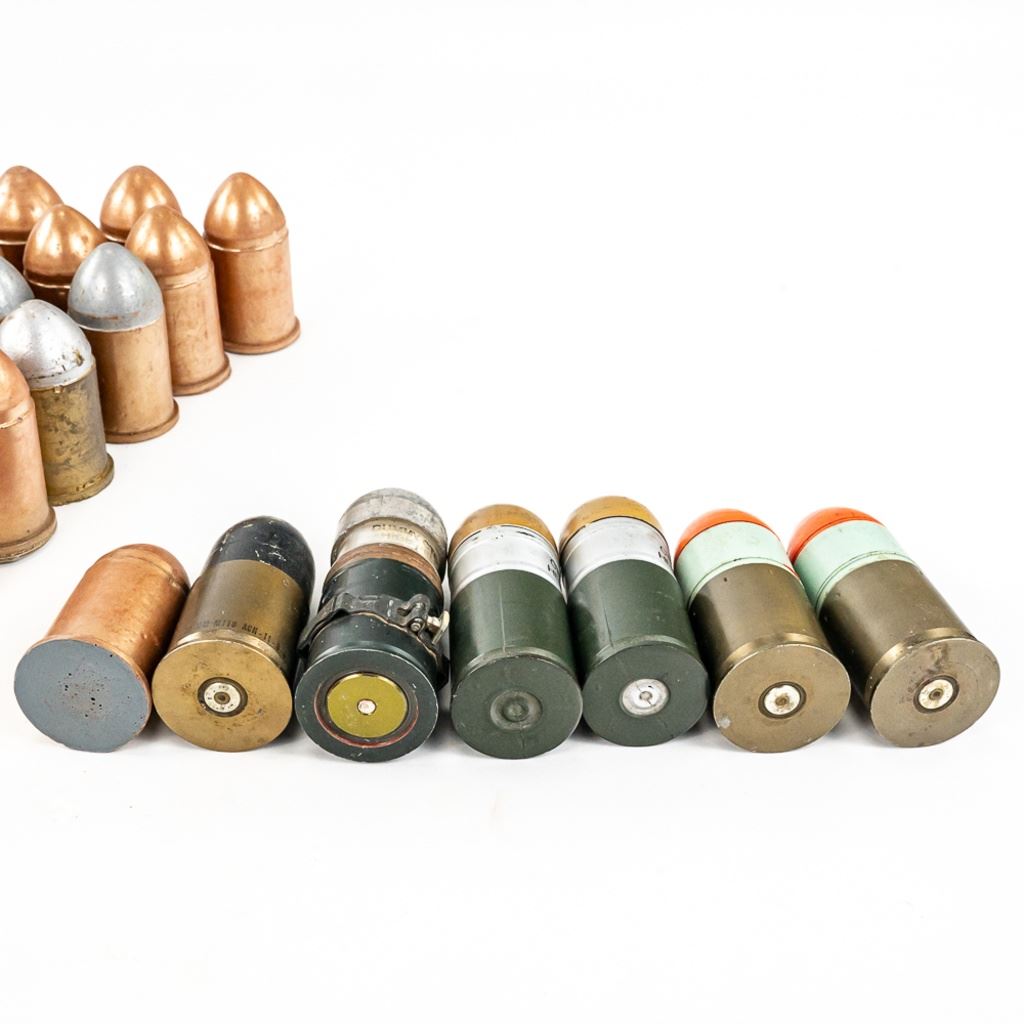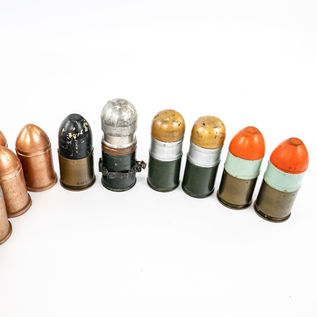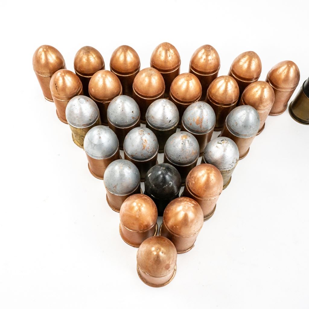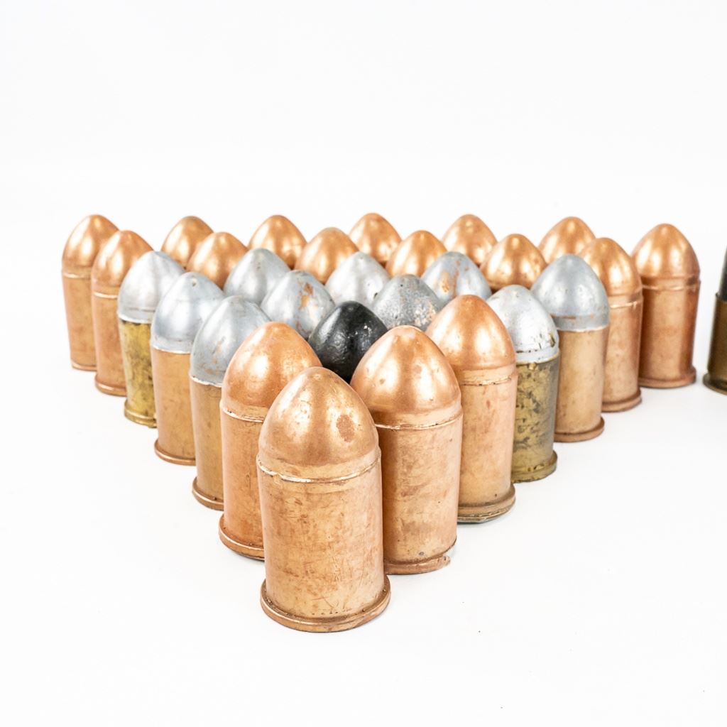 This is from the famous prop house MTS Armorer FX owned by Matthew Stratton. His props were used in many movies and TV shows in the Chicago area and nationally. This lot includes 1 dummy CTG M922, 2 orange tip dummies with M118 shells, 2 gold tip hollow plastic M-433 rounds, 1 black tip with m118 shell and 28 resin rounds.