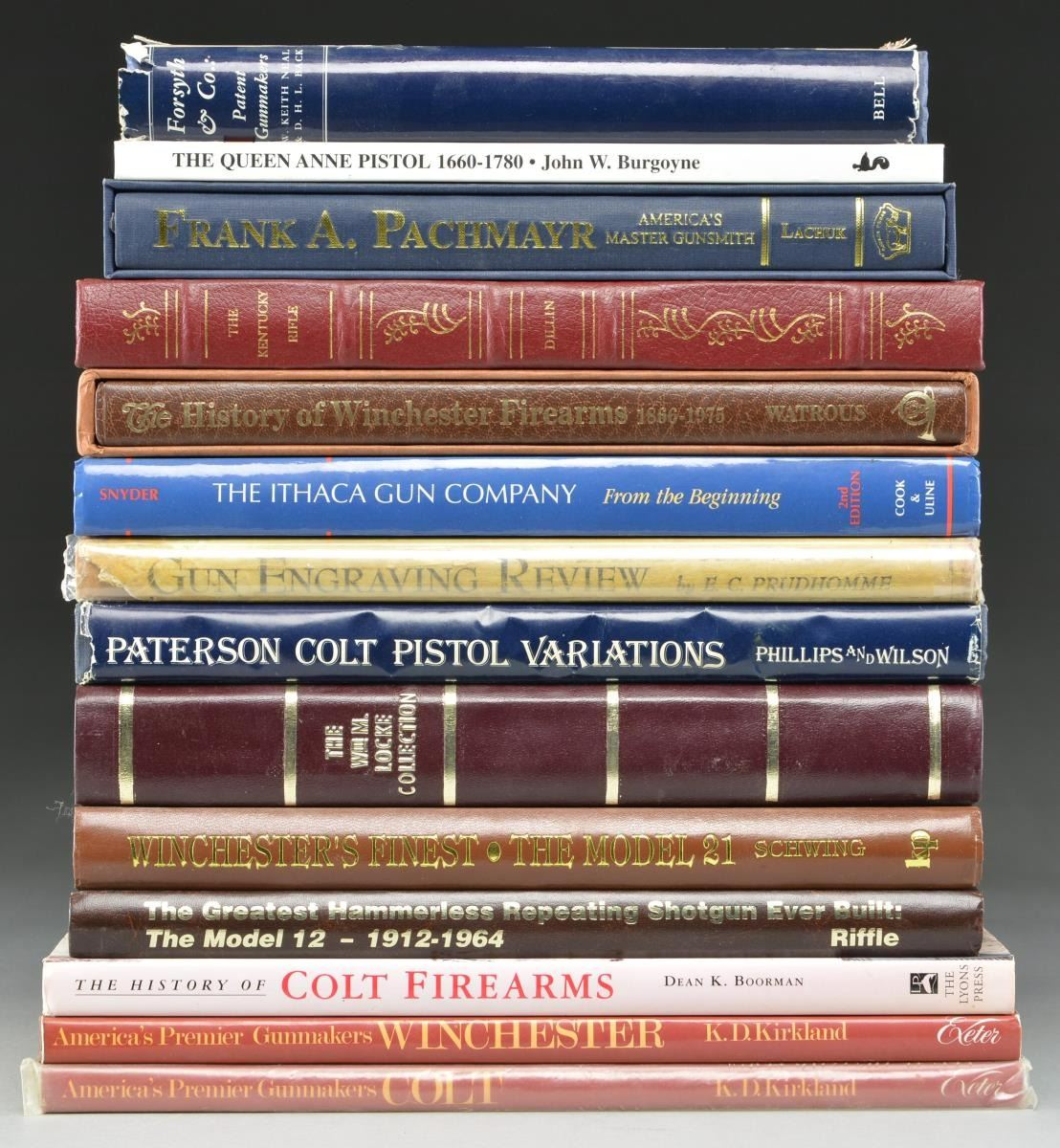 "The History of Winchester Firearms 1866-1975" by Watrous. 4th Edition w/ sleeve. "Winchester's Finest The Model 21" by Ned Schwing. "The Greatest Hammerless Repeating Shotgun Ever Built: The Model 12 - 1912-1964" by Dave Riffle. "America's Premier Gunmakers Winchester" by K.D. Kirkland. "Gun Engraving Review" by E.C. Prudhomme. "The Kentucky Rifle" by Dillon The Firearms Classics Library. "The Ithaca Gun Company" by Walter Clause Snyder. "The Wm M. Locke Collection" "The History of Colt Firearms" by Dean Boorman. "Paterson Colt pistol Variations" by Phillip Phillips & R.L. Wilson. "America's Premier Gunmakers Colt" "The Queen Anne Pistol 1660-1780" by John. W. Burgoyne. "Forsyth & Co.: Patent Gunmakers" by W. Keith Neal & D. H. L. Back. "Frank A. Pachmayr America's Master Gunsmith" by John Lachuk. #241 of 500 1st Edition signed by Safari Press. CONDITION: fair to good overall showing use, marks & scratches. Some dust jackets are missing & some have protective plastic sleeves. (02-18976-2/MD) $400-600.