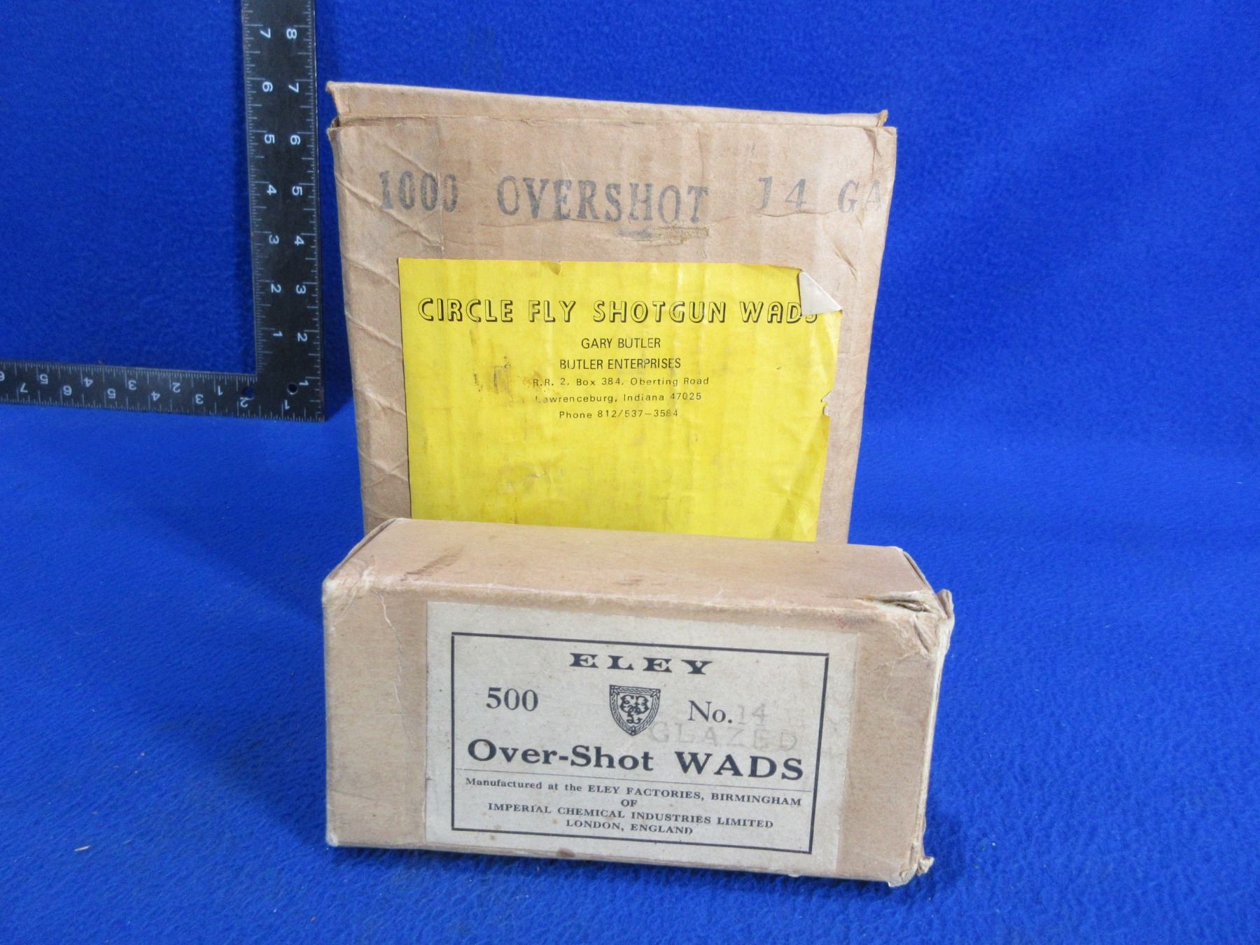 14 Gauge Circle Fly and Eley Overshot Shotgun Wads - Box of 500 Eley Appears Full, Box of 1000 Circle Fly Appears 1/4 Full