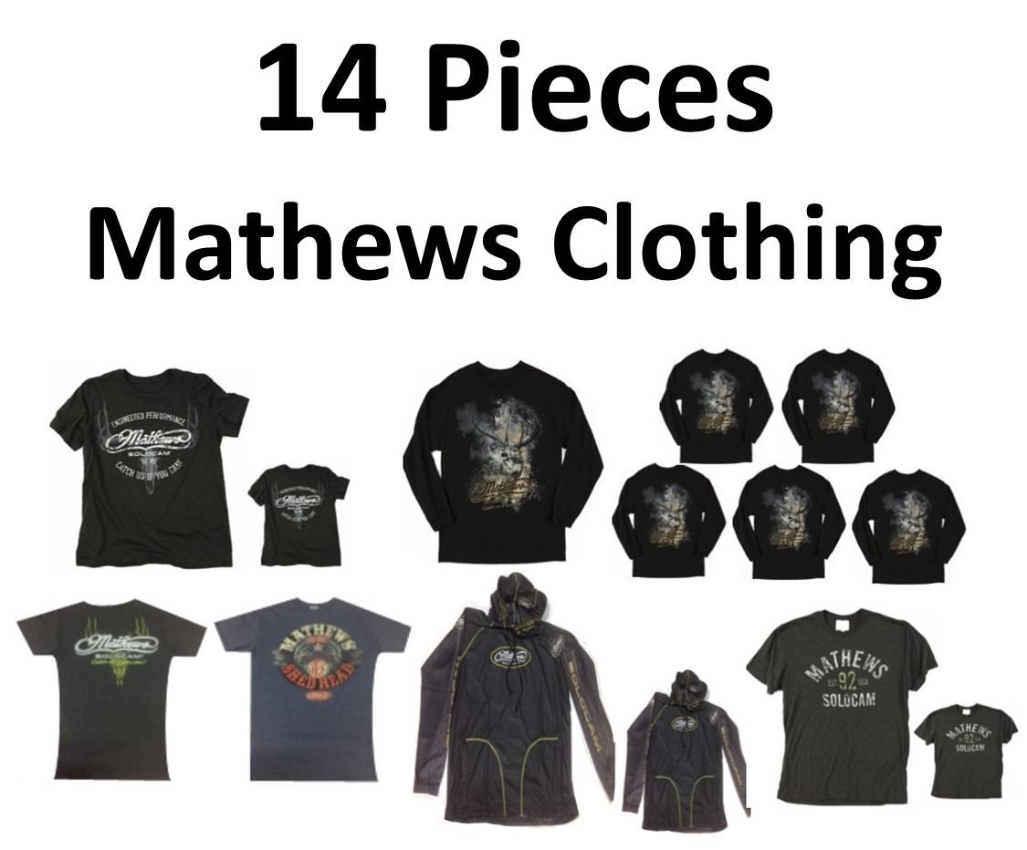 14 x Mathews Clothing, 3 x Outfitter, 1-XL, 2-2XL, 6 x Shirts, 1-Elusive L, 1-ElusiveXL, 1-Scout 2XL, 1-Short Shed Hunter Blue XL, 2-Black w/Yellow Logo XL, 3 x Charcoal Neon Green 2-L, 1-M, 2 x Performance Hoodie, 1-L, 1-XL