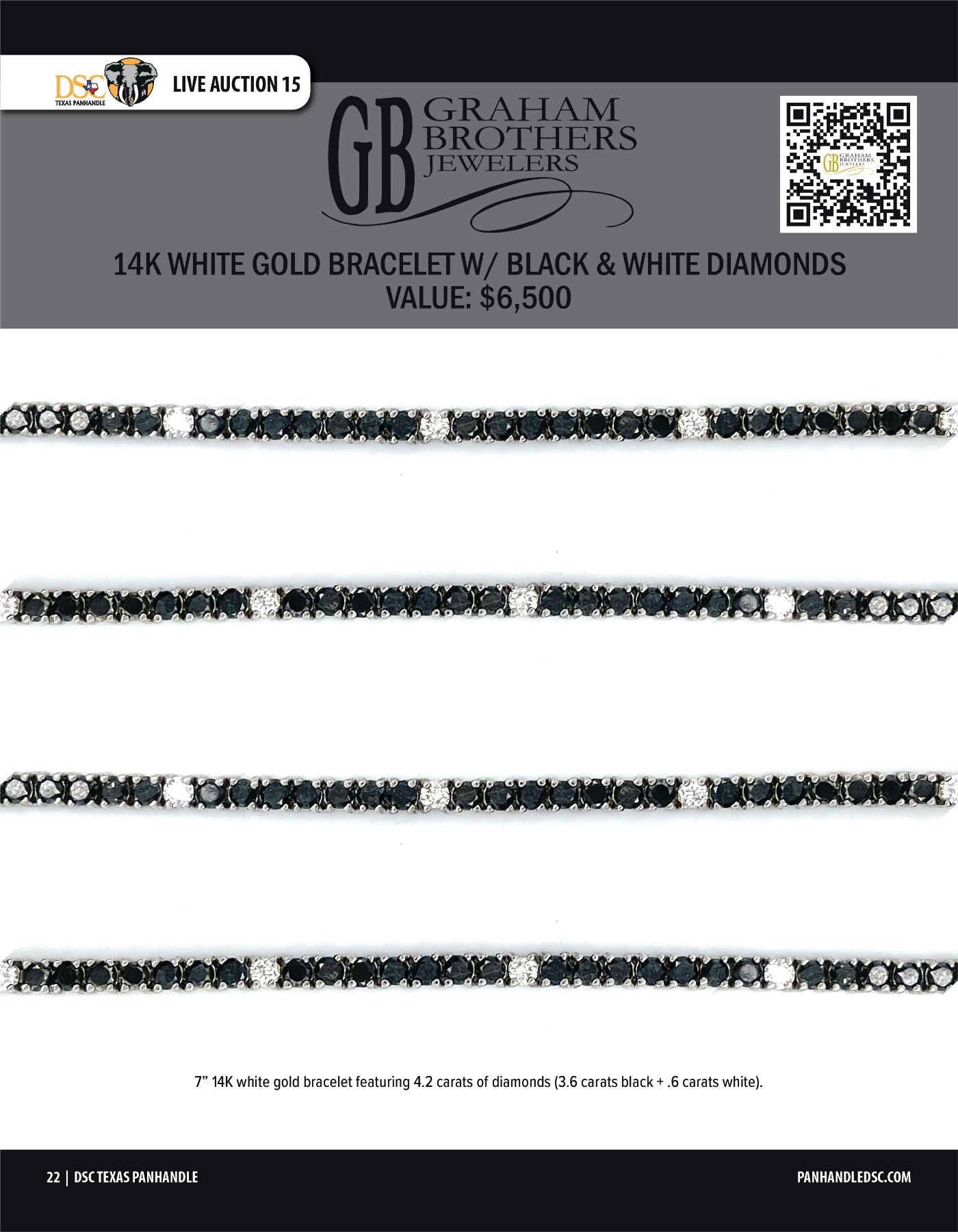 7” 14K white gold bracelet featuring 4.2 carats of diamonds (3.6 carats black + .6 carats white).