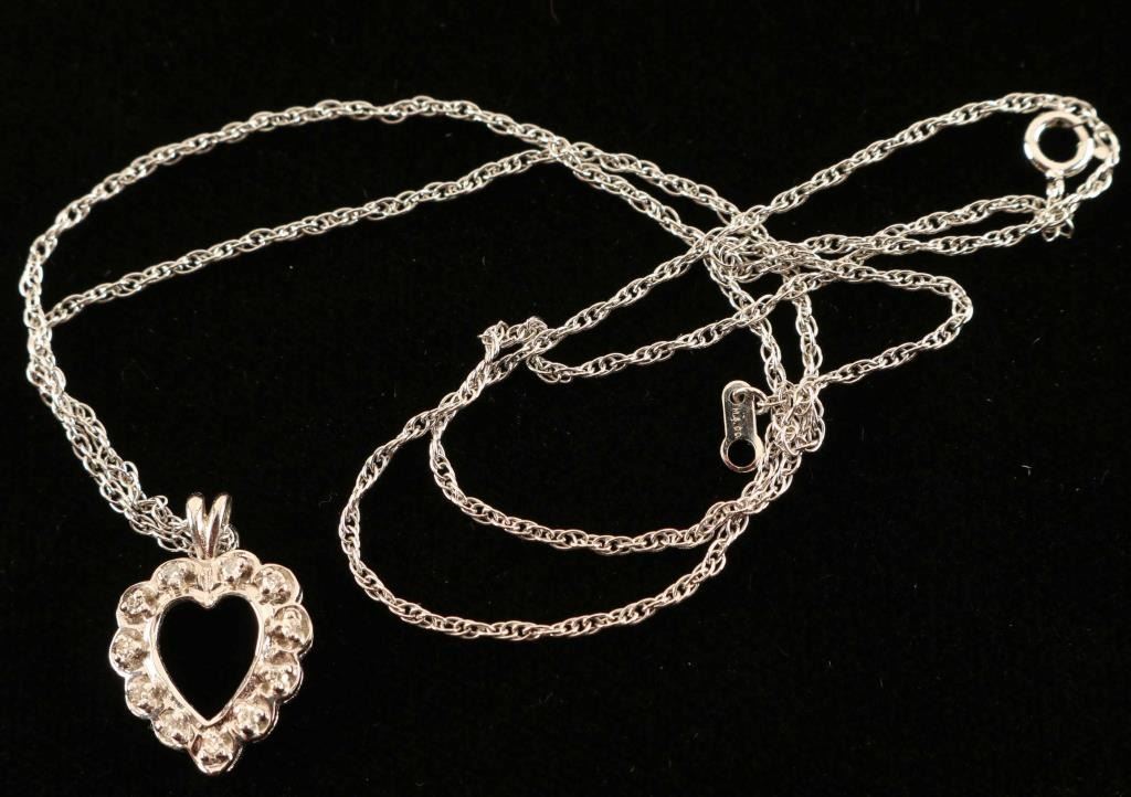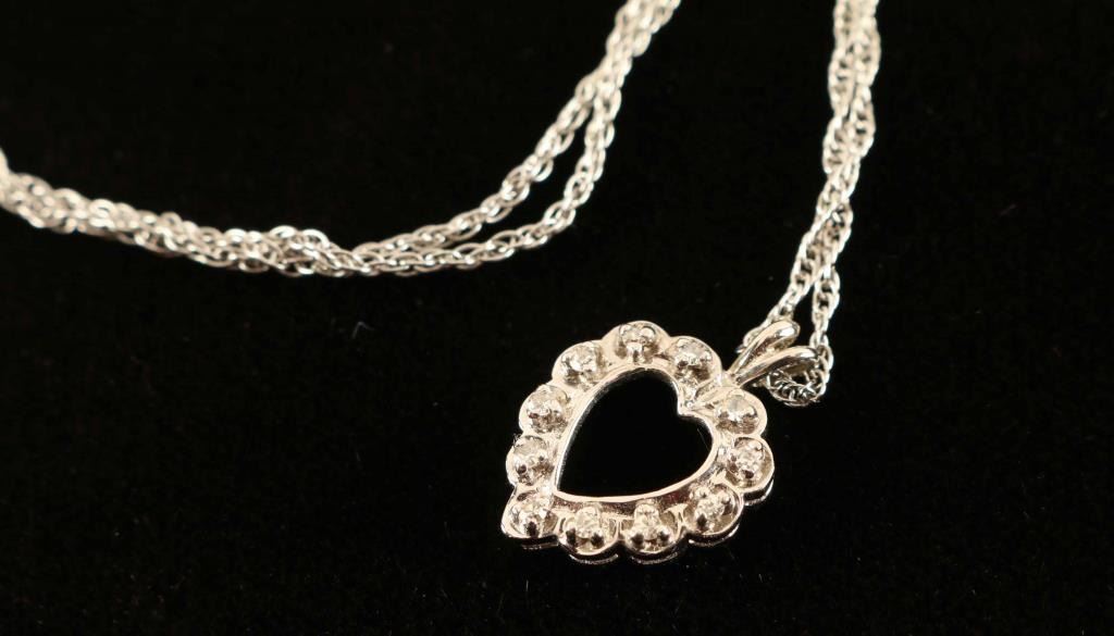 with 18" 14KT white gold Chain, pendant is shaped like a heart and measures 1/2" x 1/2".