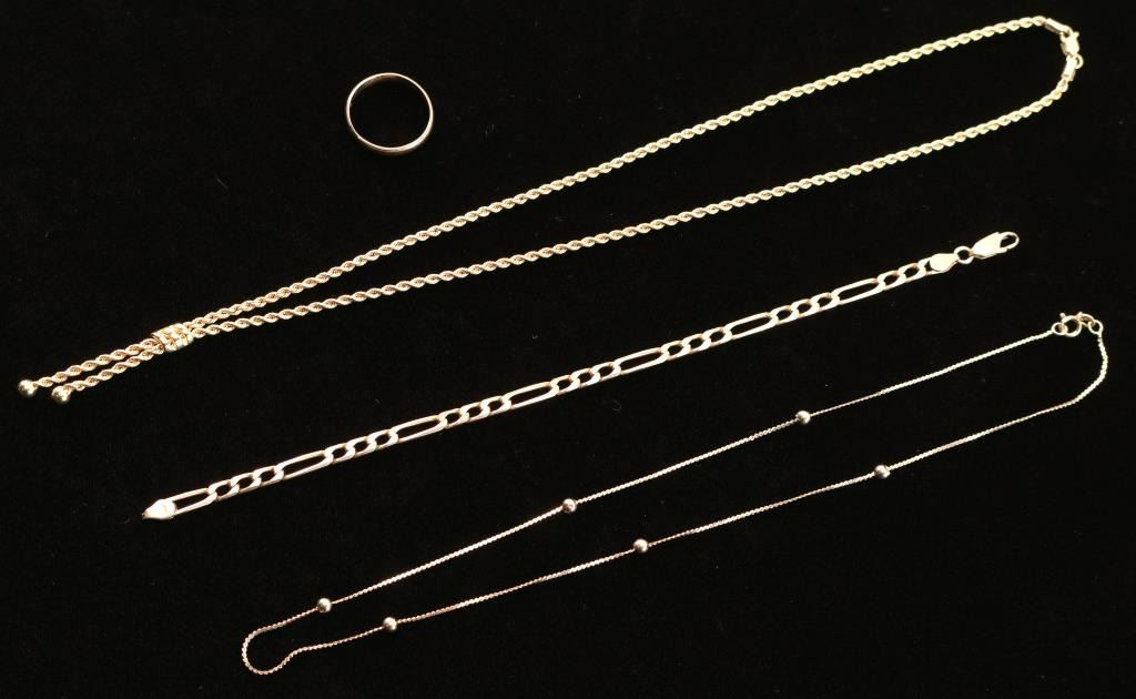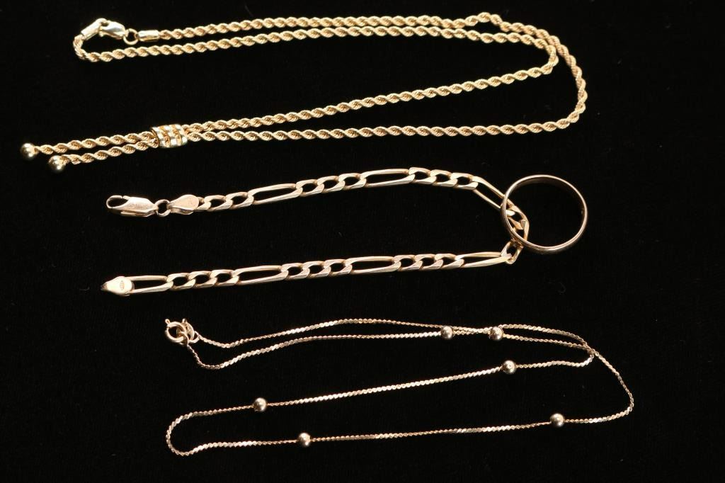 Two 14k gold necklaces, one a rope with balls design measuring 9 3/4" from drop and the other an S chain with balls design measuring 7 3/4" from drop. Also includes a 14k gold band, size 6 3/4, and a 14k gold chain link bracelet measuring 7 1/2".