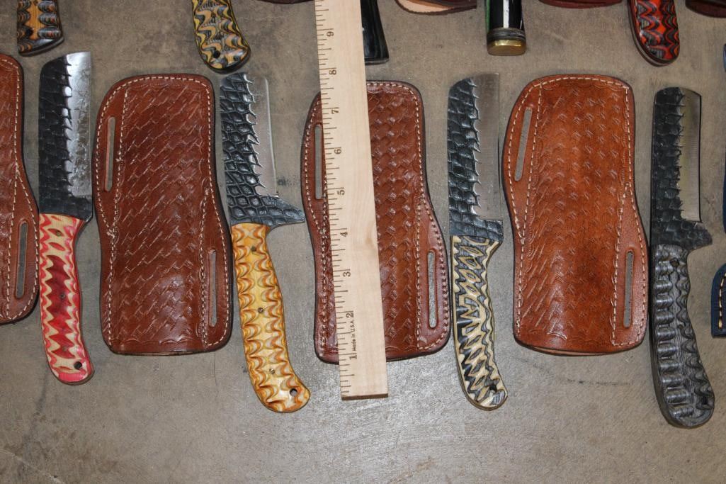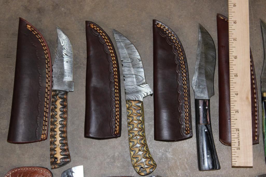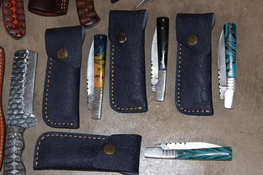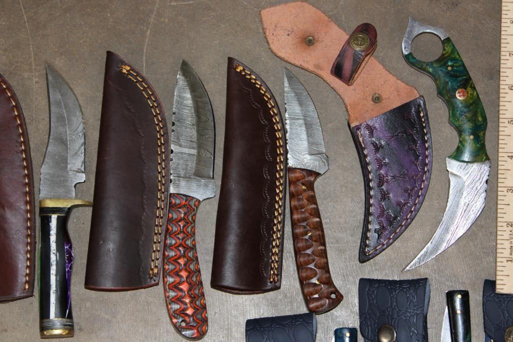 15 *New* Damascus Knives. There are 7 Fixed Blade and 4 Carbon Steel Knives. Each has a unique colorful wood or resin handle. (ONE$) FIXED BLADE AND POCKET KNIVES