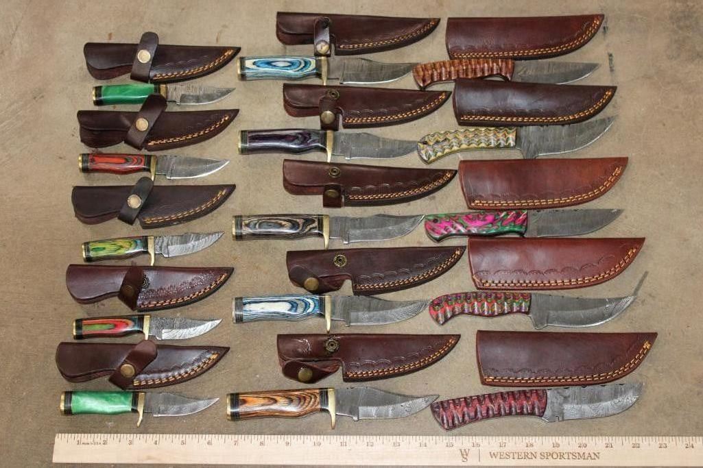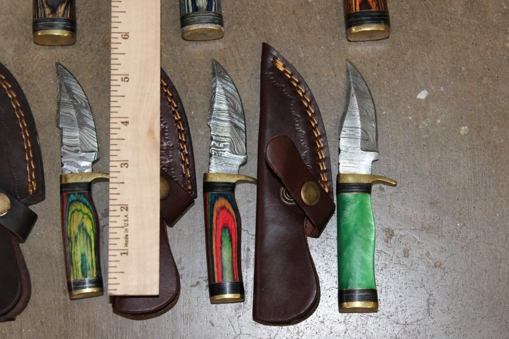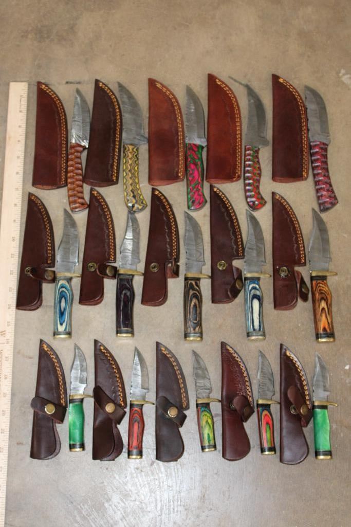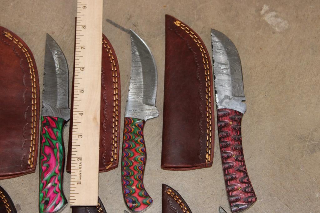 15 *New* Damascus Steel Fixed Blade KNIVES with Leather Sheaths. Most have colorful wooden handles and some have epoxy resin handles. (ONE$) FIXED BLADE KNIVES
