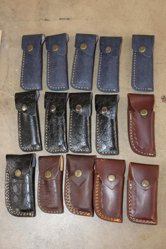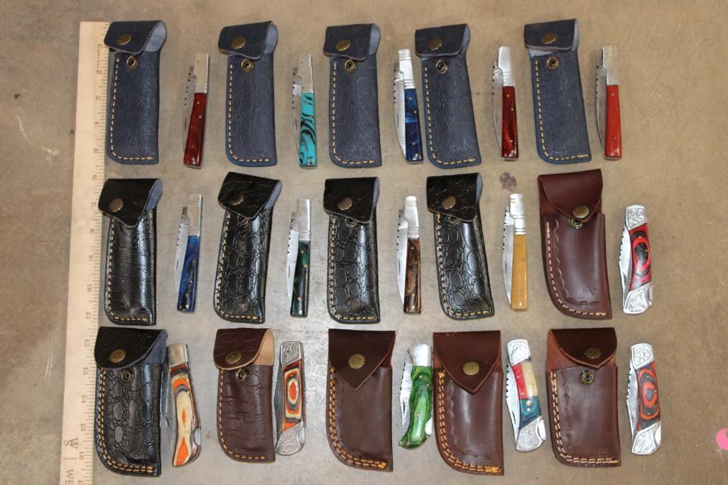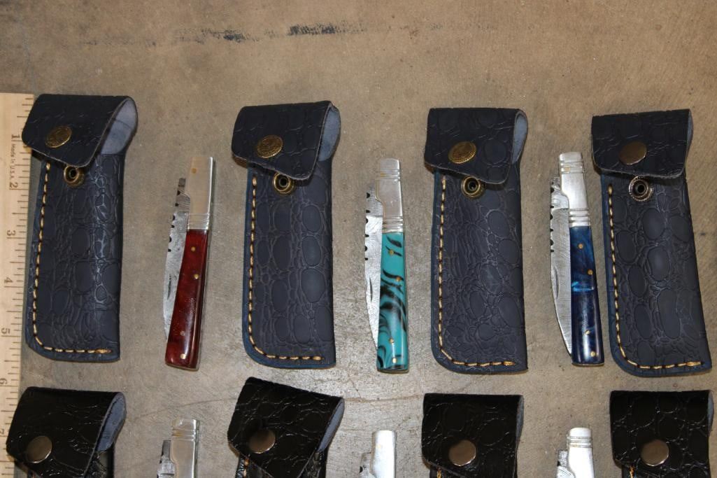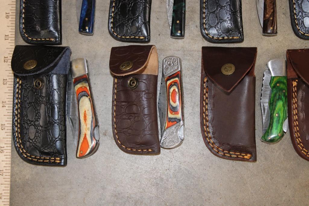 15 *New* Damascus Steel folding Pocket KNIVES with Leather Cases for carrying on a belt. Some have wood handles and some have epoxy resin handles. Each pocket knife blade varies in length, most have around a 3.5" Long blade and the total length when opened is approximately 7.75" Long.(ONE$) POCKET KNIVES