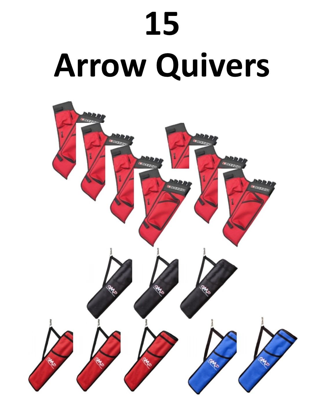 15 x Arrow Quivers, 7 x Bohning Target Quiver Red RH, 8 x OMP 3 Tube Hip, 3-Black, 3-Red, 2-Blue