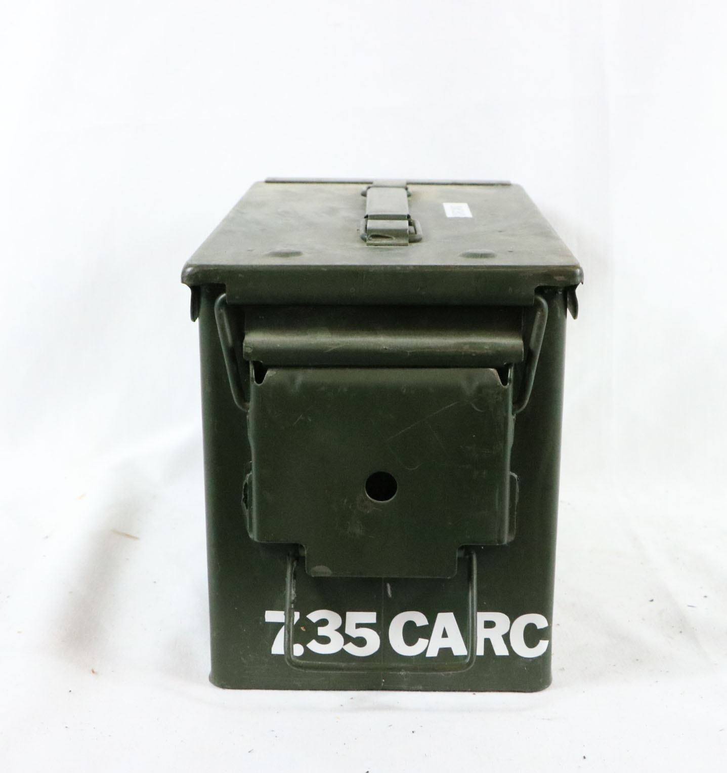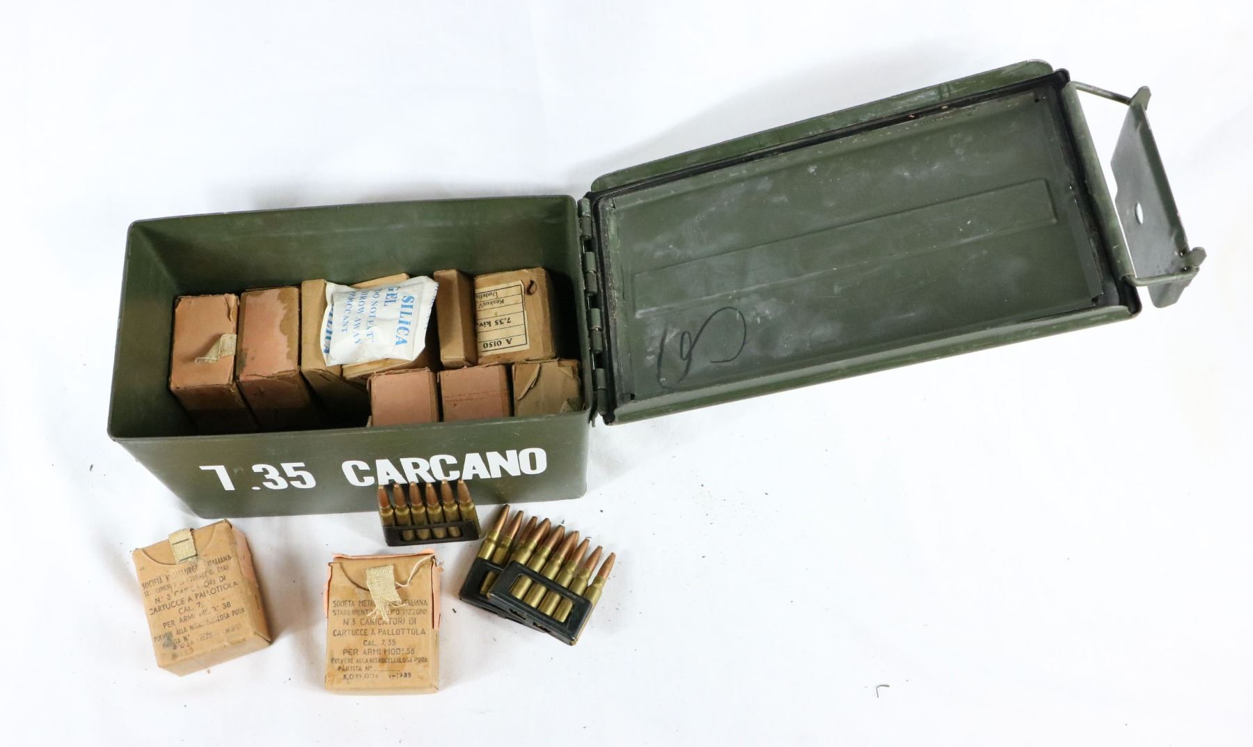 Inside this ammo can is 11 boxes of 7.35 Carcano ammo in en-bloc clips. Great find for Carcano shooters! Ammo is in good condition, see photos.