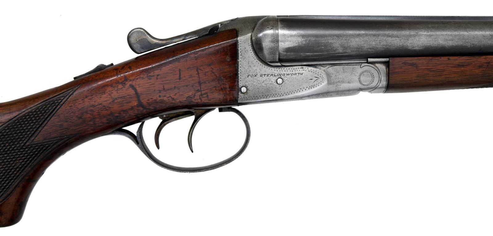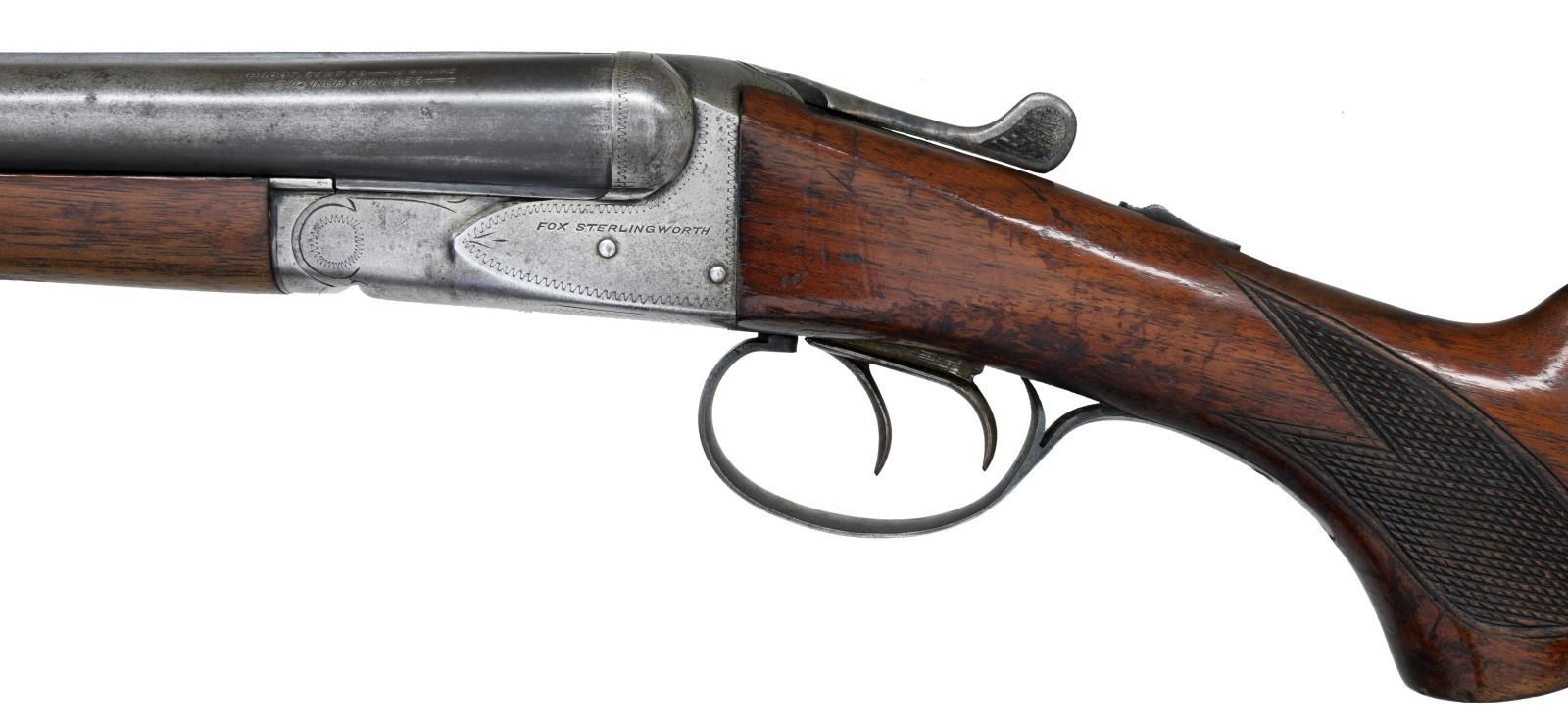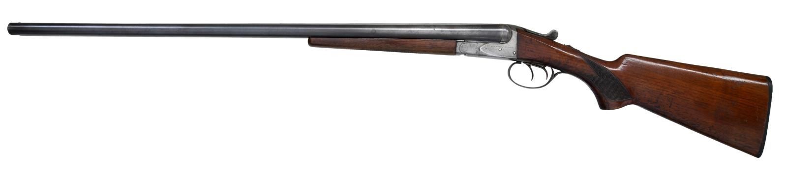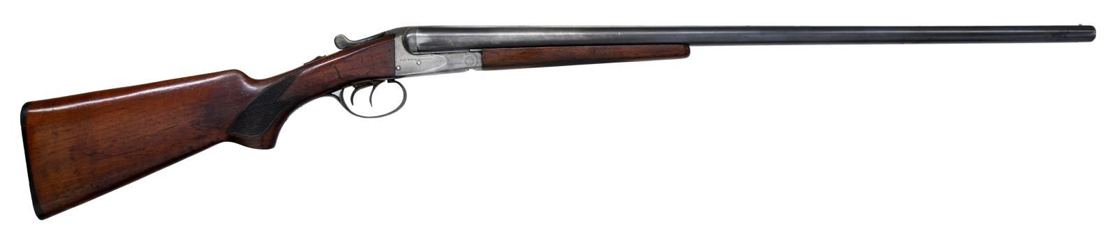 Cal. 16 Ga., 2 3/4". S# 376149. (mfg. between 1939-1942). Bbls. 28" w/ raised matted rib & bright bead. Full & Mod chokes. Boxlock action w/ dbl. triggers, extractor & automatic safety. Checkered walnut stock set. LOP: 13 1/2" to grooved hard rubber buttplate. WEIGHT: 6.38 lbs. CONDITION: fair faded bbl. blue mixing w/ gray patina showing spots of peppery oxidation & deep marks. Case colors have faded to gray on external surfaces w/ colors visible in protected areas of action & forearm; action shows patina & marks. Wood has fair varnish showing large areas of worn finish, deep impression & scratches. Bright shiny bore w/ fouling near chambers. Action appears tight on face & lever rests at center. (23-1132/MD). CURIO. $500-650.