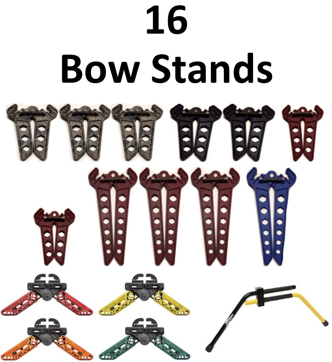 16 x Bow Stands, 11 x OMP, 3-Parallel AP, 2-Single Black, 1-Parallel Red, 1-Mathews Red, 3-Red, 1-Long Blue, 4 x Pine Ridge, 1-Red, 1-Orange, 1-Yellow, 1-Forest Green, 1 x Gas Pro Black/Yellow