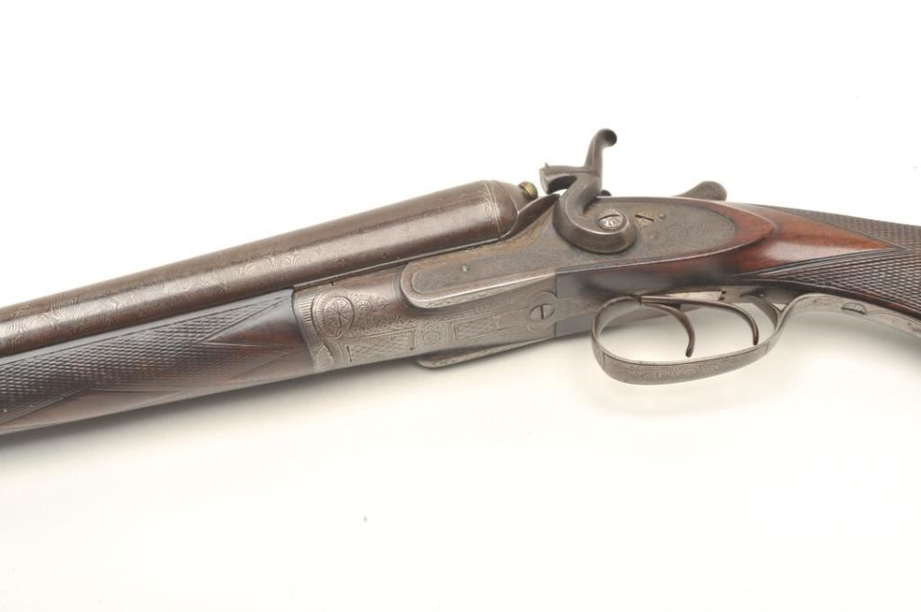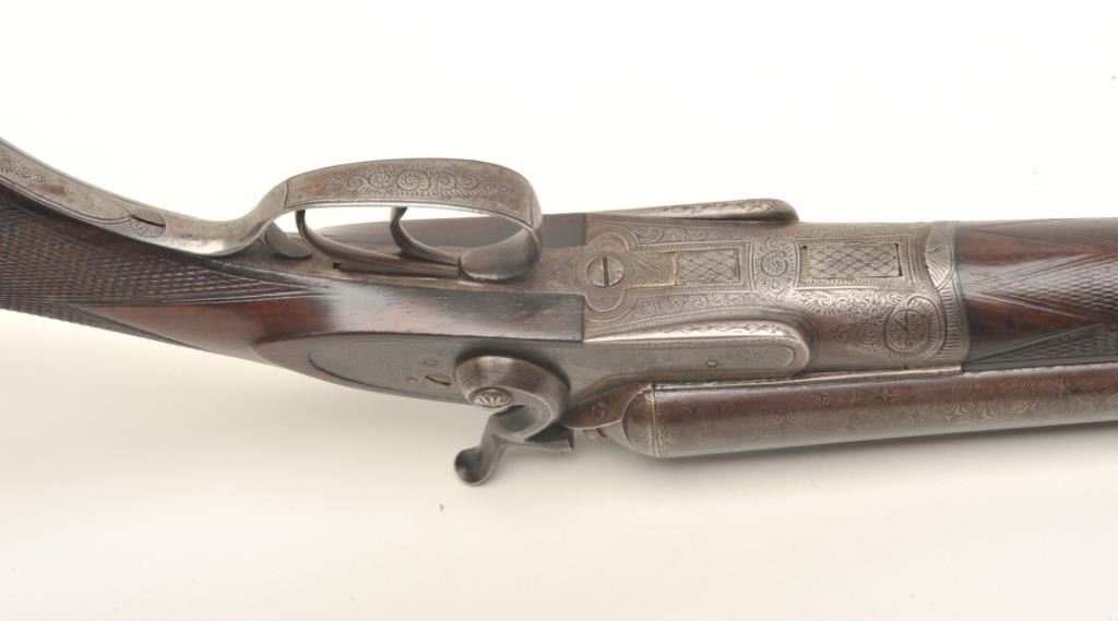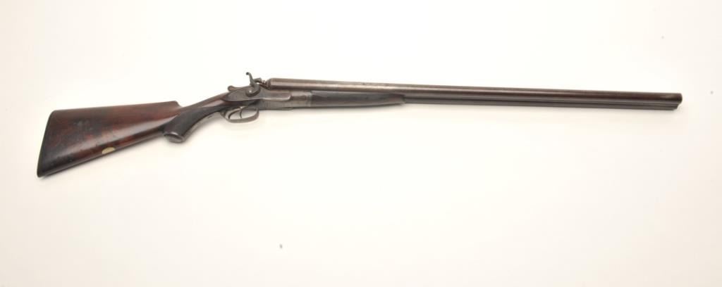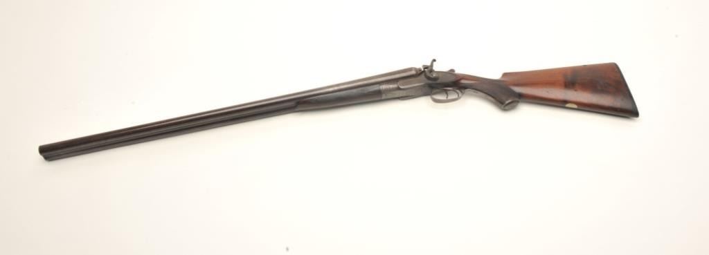 16IN-6 MANTON & RICHARD #10278Manton & Richards side by side hammer shotgun, approximately 12 gauge, serial #10278. The shotgun is in good overall condition with 30” Damascus steel barrels with a full-length rib and brass bead frontsight. The barrel address reads, “Richards and Co. London Fine Damascus Field Gun”. The barrels have gone to a pleasing brown color while the muted case colors of the receiver have become silver with age. The receiver,tang and trigger guard all feature pleasing scroll engraving throughout. The finely checkered wood stocks are in good condition showing use with mars, dents and compressions. The butt stock ends with ahard rubber butt plate and a 14 ½” LOP to the front trigger. The bores are good, the action functions and the markings are crisp on this desirable hammer gun. Est.: $400-800. (Antique).Manton & Richards side by side hammer shotgun, approximately 12 gauge, serial #10278. The shotgun is in good overall condition with 30” Damascus steel barrels with a full-length rib and brass bead frontsight. The barrel address reads, “Richards and Co. London Fine Damascus Field Gun”. The barrels have gone to a pleasing brown color while the muted case colors of the receiver have become silver with age. The receiver,tang and trigger guard all feature pleasing scroll engraving throughout. The finely checkered wood stocks are in good condition showing use with mars, dents and compressions. The butt stock ends with ahard rubber butt plate and a 14 ½” LOP to the front trigger. The bores are good, the action functions and the markings are crisp on this desirable hammer gun. Est.: $400-800. (Antique).