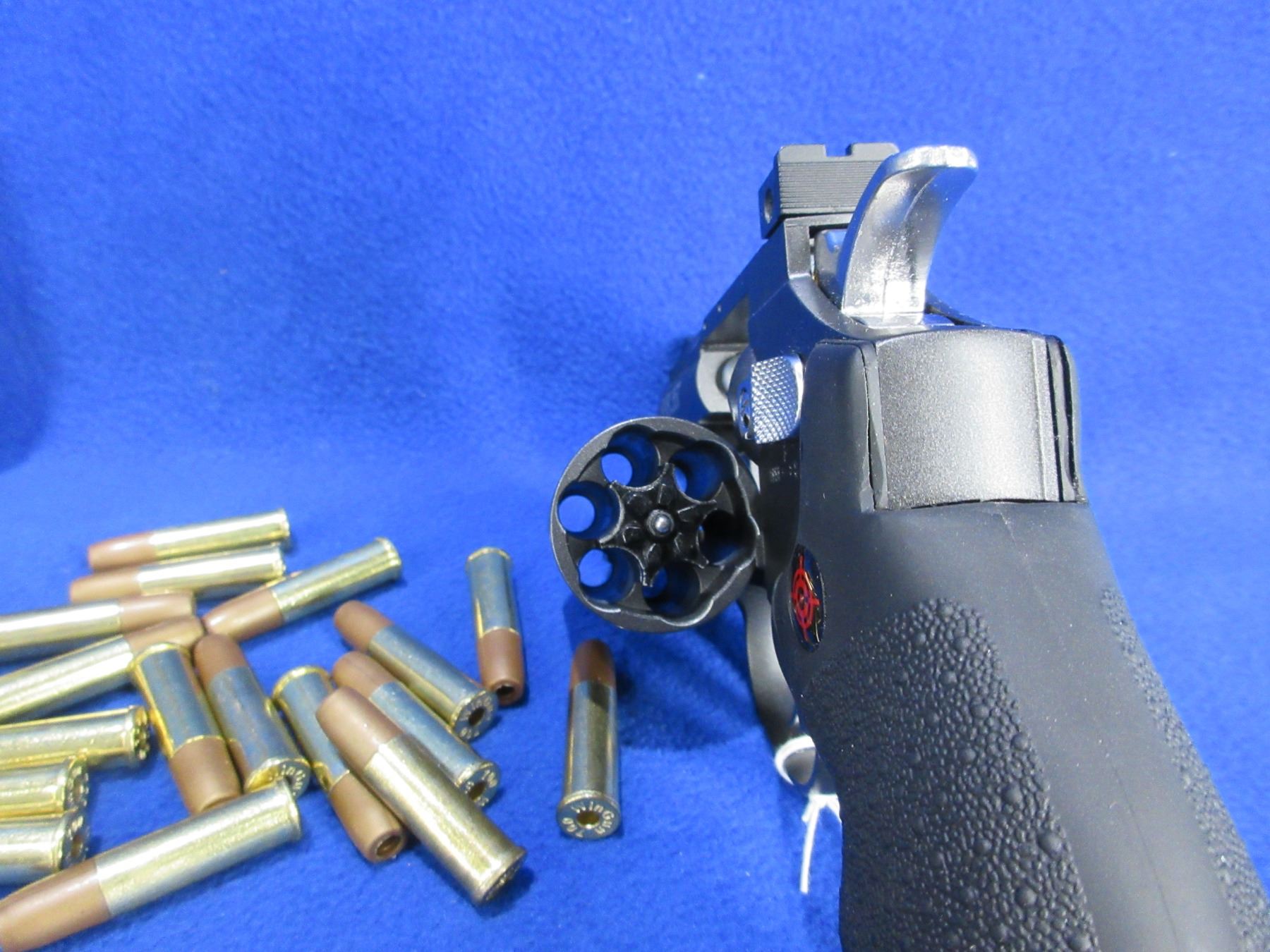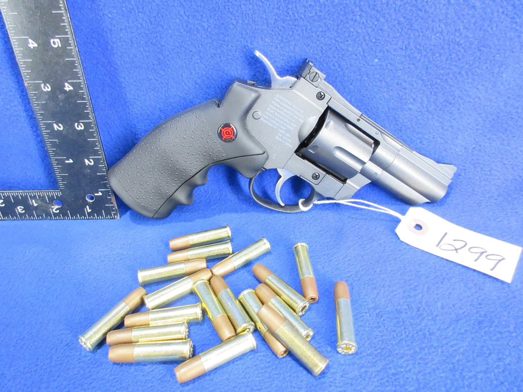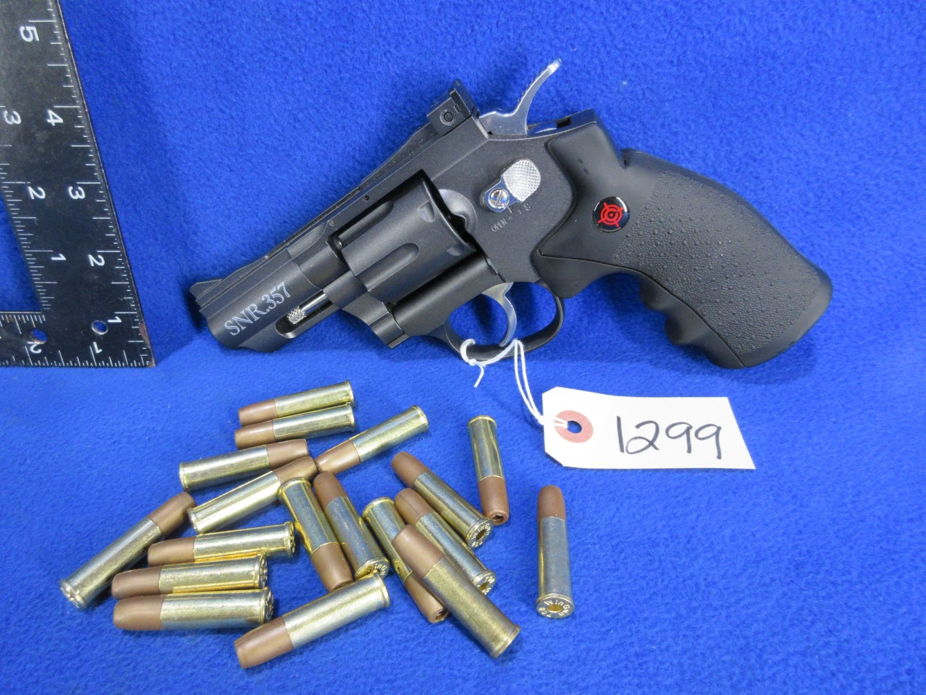 .177 Cal. Crosman SNR357 Dual Ammo Snub Nose CO2 Air Revolver - 3" non rifled barrel, uses a 12-gram CO2 cartridge, 6rd swing-out cylinder comes with 18 reusable BB and pellet cartridges, double/single-action semi-auto repeater, steel BBs 400 fps / lead pellets 350 fps, manual safety. Ser. # 17E36996