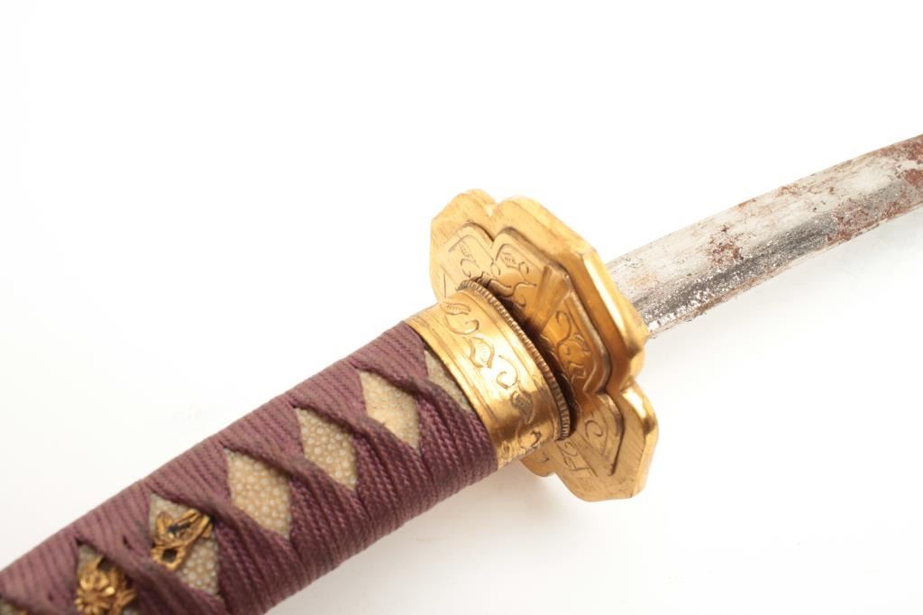 17ASB-257 MODERN BOYS SWORDJapanese Boy’s sword with scabbard. This modern reproduction is 20” in total length with a 14” blade. The blade is in fair condition with moderate surface rust and flaking of finish. It does not appear tohave been sharpened. The gold tone hand guard and ray wrapped grip are in good condition. The scabbard is in good condition with brass ornamentation and inlay. This is a nice, modern youth’s sword that wouldbenefit from some TLC. Est.: $100-200Japanese Boy’s sword with scabbard. This modern reproduction is 20” in total length with a 14” blade. The blade is in fair condition with moderate surface rust and flaking of finish. It does not appear tohave been sharpened. The gold tone hand guard and ray wrapped grip are in good condition. The scabbard is in good condition with brass ornamentation and inlay. This is a nice, modern youth’s sword that wouldbenefit from some TLC. Est.: $100-200