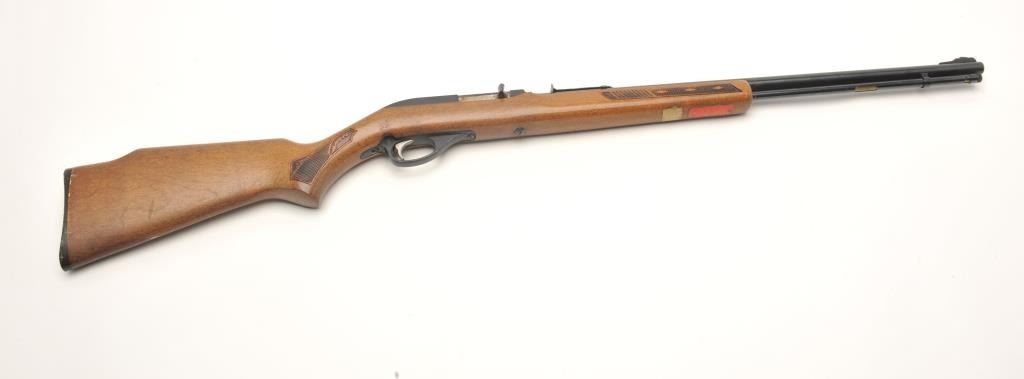 17ASB-45 MARLIN MOD 60 #23610189Marlin Model 60 semi-auto rifle, .22 L.R. caliber, serial #23610189. The rifle is in very good overall condition with a 22” round barrel. The barrel, magazine and receiver retain nearly all of their blued finish withonly minor handling marks noted. The smooth wood stock is in very good condition with only light storage marks. The butt stock ends with a plastic butt plate. The bore is very good, the action crisp and markings aresharp on this lightly used Marlin. (Modern) Est.: $50-100.Marlin Model 60 semi-auto rifle, .22 L.R. caliber, serial #23610189. The rifle is in very good overall condition with a 22” round barrel. The barrel, magazine and receiver retain nearly all of their blued finish withonly minor handling marks noted. The smooth wood stock is in very good condition with only light storage marks. The butt stock ends with a plastic butt plate. The bore is very good, the action crisp and markings aresharp on this lightly used Marlin. (Modern) Est.: $50-100.