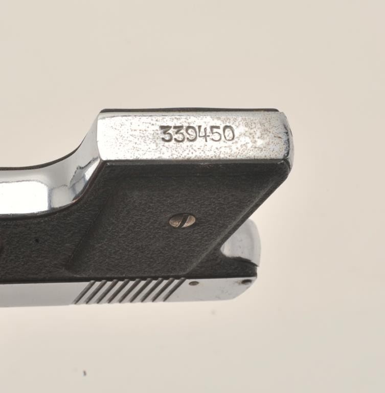 17AX-4 SLAVIA NON GUN #339450Slavia non-gun copy of a small semi-automatic pistol. The frame is finished in nickel and marked made in Czechoslovakia. The textured rubber grips are in good condition and marked, “Slavia” in cursive script. The butt bears the serial #339450. Est.: $50-$100.Slavia non-gun copy of a small semi-automatic pistol. The frame is finished in nickel and marked made in Czechoslovakia. The textured rubber grips are in good condition and marked, “Slavia” in cursive script. The butt bears the serial #339450. Est.: $50-$100.