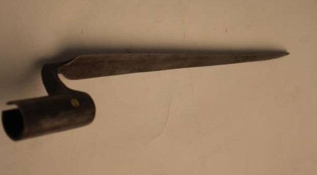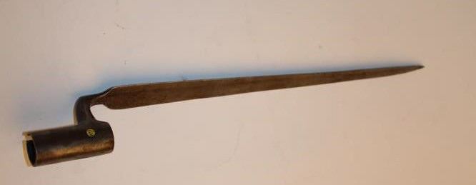 17EE-3 BAYONETPre-Revolutionary War bayonet; hand forged by a blacksmith prior to United States and not marked; very good overall condition; forging seam is visible on socket and rear of blade. Est.: $150-$300.Pre-Revolutionary War bayonet; hand forged by a blacksmith prior to United States and not marked; very good overall condition; forging seam is visible on socket and rear of blade. Est.: $150-$300.