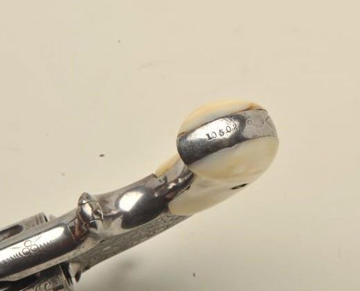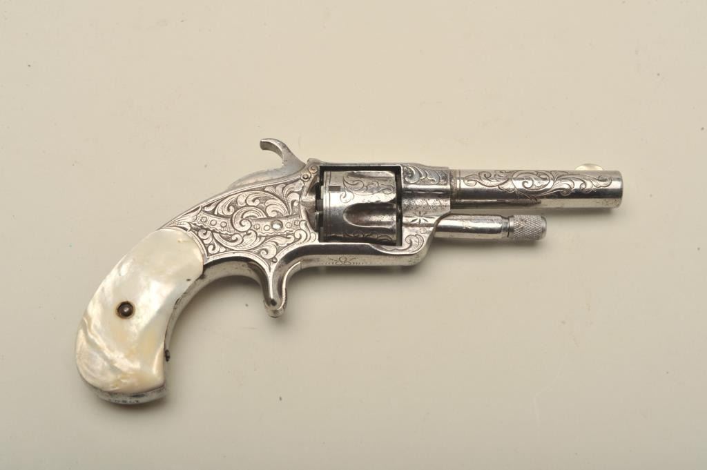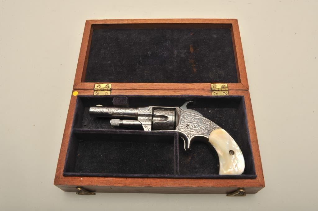 17FL-173 OTIS SMITH #10502Otis Smith spur trigger revolver, Nimschke engraved, .30 caliber, 3” round barrel, pearl grips, S/N 10502, in overall good to very good condition with a crisp action, extensive coverage of engraving, beautiful iridescentpearl grips; contained in a wood presentation casing with purple lining. (Antique). Est.: $1,000-$2,000.Otis Smith spur trigger revolver, Nimschke engraved, .30 caliber, 3” round barrel, pearl grips, S/N 10502, in overall good to very good condition with a crisp action, extensive coverage of engraving, beautiful iridescentpearl grips; contained in a wood presentation casing with purple lining. (Antique). Est.: $1,000-$2,000.