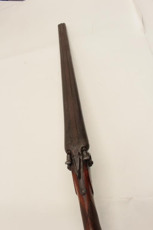 17FS-232 T. DUMOULIN&CO. SXS 12GA 29.5" #3887T. Duoulin & Co. SxS exposed hammers shotgun, 12 gauge, 30” barrels, dark patina to metal surfaces, checkered wood stocks, S/N 3887, in overall un-cleaned out-of-the-attic condition; working actions, classic wearto wood stocks; a great “wall hanger”! (Antique). Est.: $100-$200.T. Duoulin & Co. SxS exposed hammers shotgun, 12 gauge, 30” barrels, dark patina to metal surfaces, checkered wood stocks, S/N 3887, in overall un-cleaned out-of-the-attic condition; working actions, classic wearto wood stocks; a great “wall hanger”! (Antique). Est.: $100-$200.