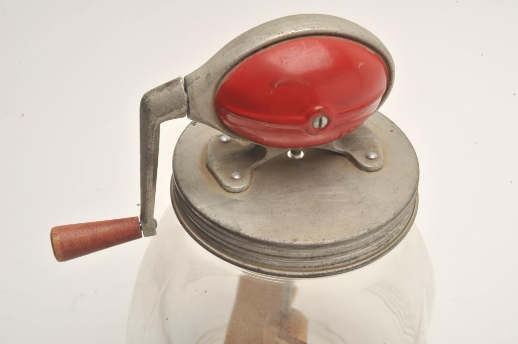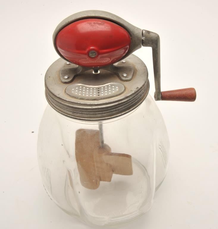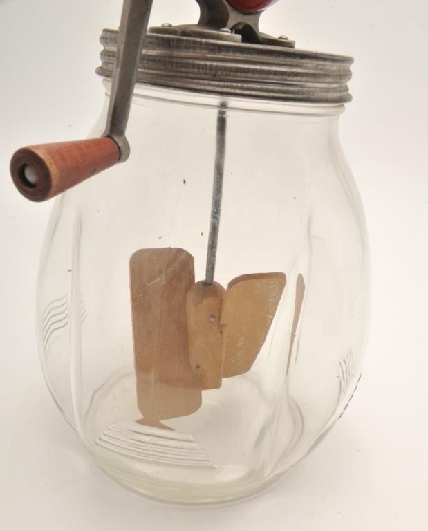 17FU-13 BUTTER CHURN LARGE CIRCA 1940sLarge glass butter churn, approximately 15” in height, ca. 1940’s; a neat decorator! Est.: $100-$200.Large glass butter churn, approximately 15” in height, ca. 1940’s; a neat decorator! Est.: $100-$200.