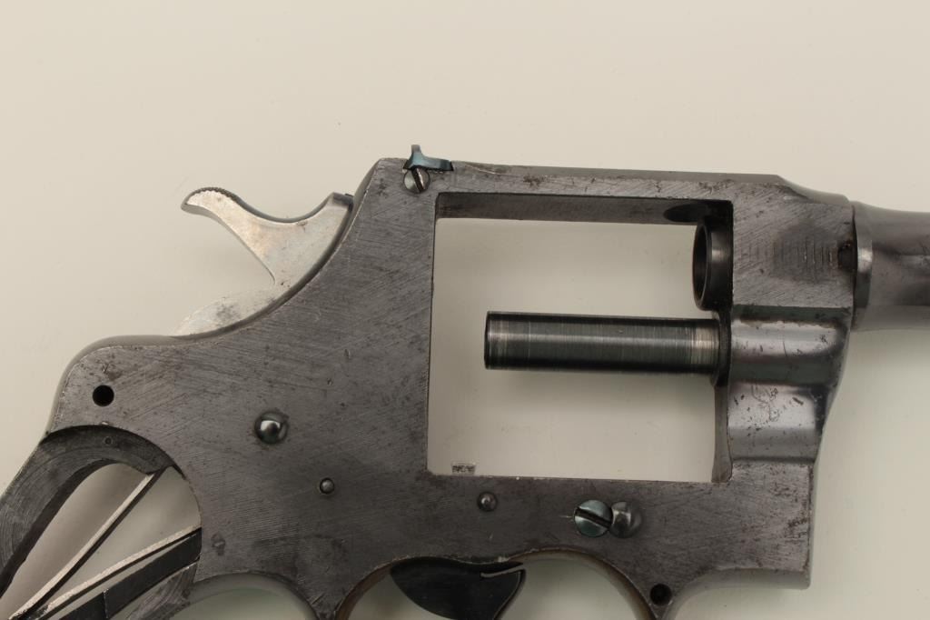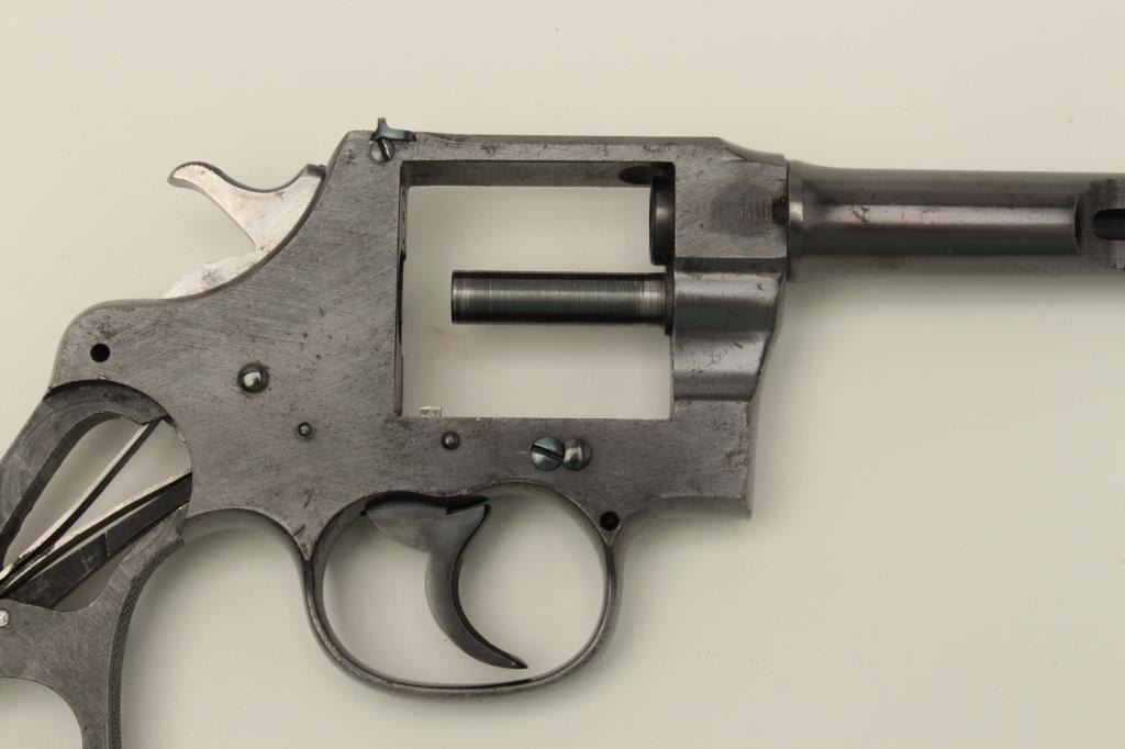 17GS-6 COLT NEW SERVICE CUT-AWAYColt New Service Target factory cut-away display board frame, 7 ½” barrel, .45 Colt caliber, Serial #113408. The revolver retains approximately 90% of its original blue finish with small storage marks. The rightside is cut down for a display board with no cylinder and barrel cut-away to show rifling. Internal grip frame has a large, “E” proof. Originally from the Johnny Bassett Collection sold at auction by Little John’sNovember 9, 2003. To the consignor who notes, the pistol was made in 1916 and listed as, “Scrapped” on March 23, 1942. The pistol is featured in photo and description on page 20 of Colt New Service Revolvers byBob Murphy. From the Gil Newton Collection. Est.: $1400-2800Colt New Service Target factory cut-away display board frame, 7 ½” barrel, .45 Colt caliber, Serial #113408. The revolver retains approximately 90% of its original blue finish with small storage marks. The rightside is cut down for a display board with no cylinder and barrel cut-away to show rifling. Internal grip frame has a large, “E” proof. Originally from the Johnny Bassett Collection sold at auction by Little John’sNovember 9, 2003. To the consignor who notes, the pistol was made in 1916 and listed as, “Scrapped” on March 23, 1942. The pistol is featured in photo and description on page 20 of Colt New Service Revolvers byBob Murphy. From the Gil Newton Collection. Est.: $1400-2800